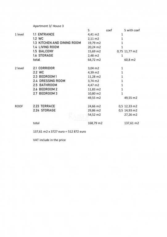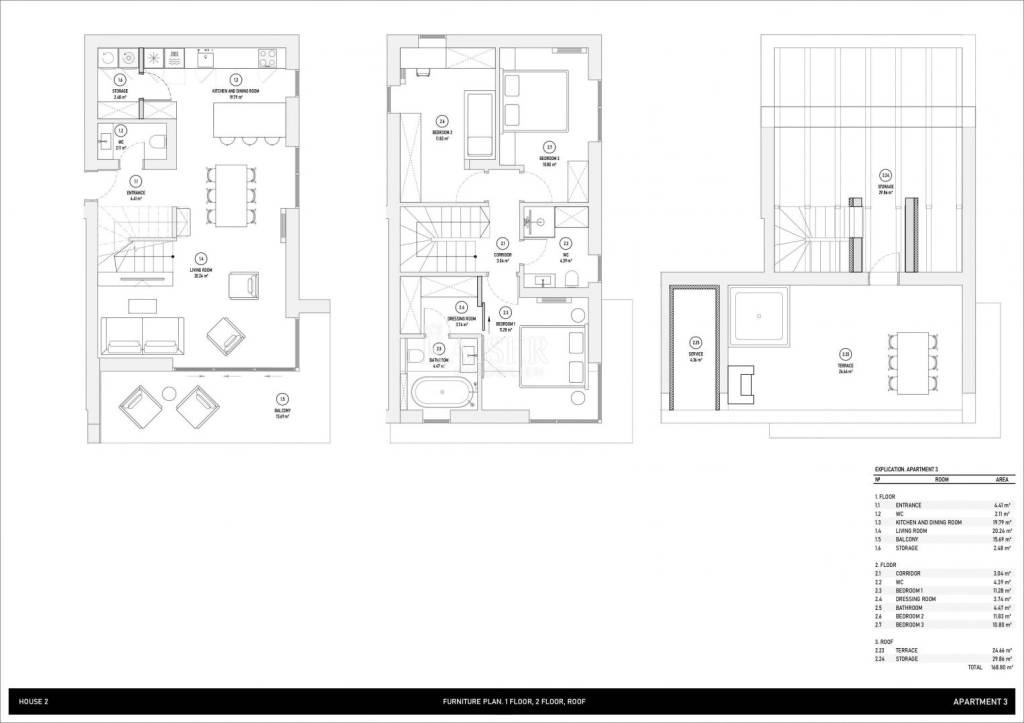 This three-story apartment (H2A3) has a total area of 168.79 m2 (taking into account the associated coefficients of 137.61 m2) and consists of the 1st floor, 2nd floor and an attic floor with a roof terrace.