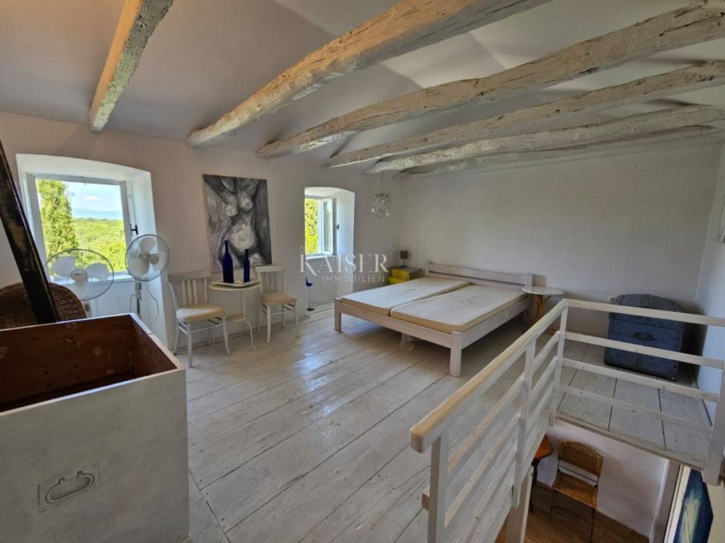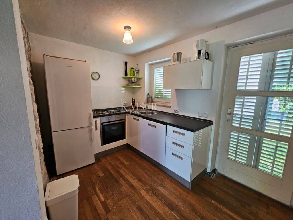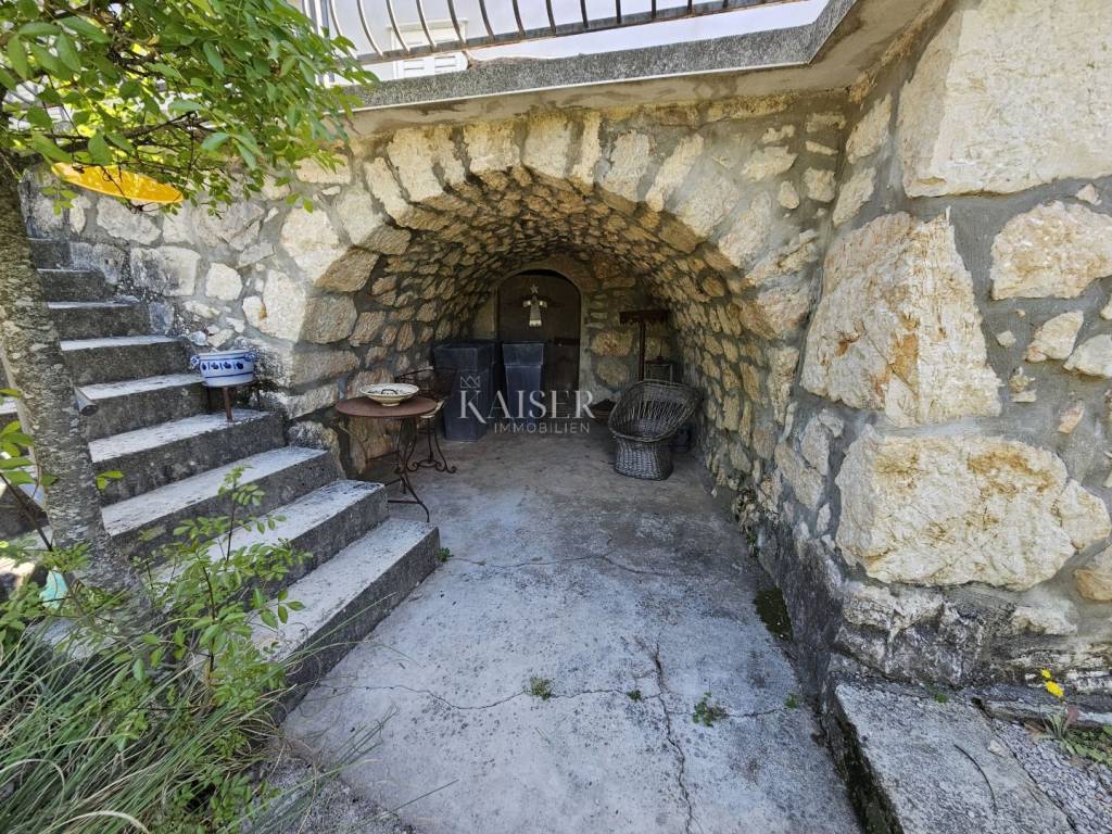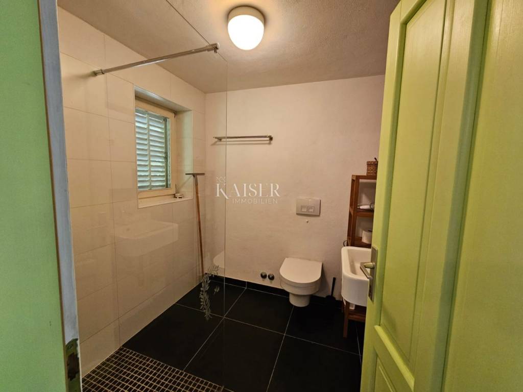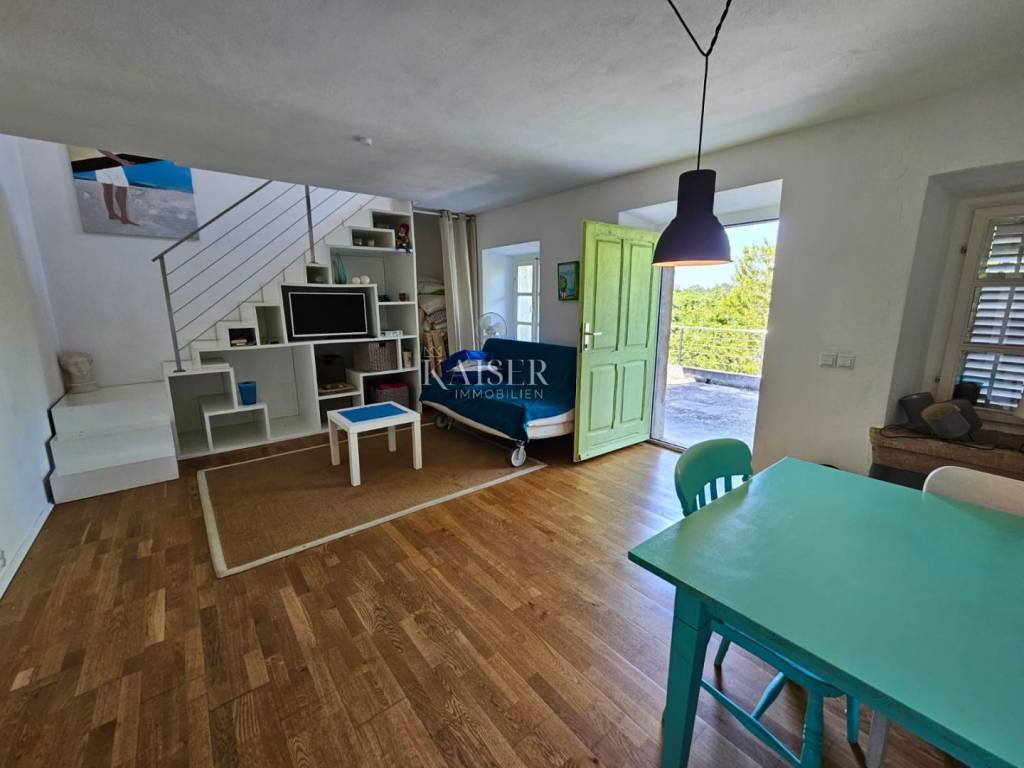 Kaiser immobilien mediates the sale of this beautiful property in the vicinity of Dobrinj on the island of Krk. In a peaceful and idyllic setting, on the edge of the green belt, the 1,500m2 property offers a peace that is difficult to describe in words. In nature, it is about three adapted stone houses in a row, each with a separate entrance, with a total living area of 150m2. The first house, ground floor, consists of an entrance hall, living room, kitchen and dining room, hallway, bathroom, storage room and bedroom. In the living room there is also a wood stove for heating and a special atmosphere. There are also inverter air conditioners in the living room and bedroom. The second house consists of a living room, a kitchen and a dining room and a bathroom, and the stairs lead to the mezzanine floor where the bedroom is located. The third house consists of a living room, a kitchen and a dining room and a bathroom, and the stairs lead to the first floor where there is a spacious bedroom. The bedroom opens onto a terrace with a wonderful view of the nearby forest and unique sunsets on the Mediterranean. The western orientation of the houses offers sufficient insolation, and all three houses have access to a spacious shared terrace, while two houses have access from the kitchen to the terrace on the east side of the house. Each house has its own tavern, and all the taverns together form an area of 100m2, currently serving as a storage room/tool room. The building's carpentry is wooden, in good condition, the floors are partly laminate, parquet and ceramics. The facility, although connected to the water supply, has a cistern for rainwater, which together with the water pump is in operation and provides water from renewable sources. The property was adapted in 2001 when, among other things, new electricity and water installations were made, and a new roof was made. A special advantage of this property is the spacious garden, which, in addition to the beautiful established horticulture, offers various possibilities. There is enough space for parking in the garden, and there is also a garage for one vehicle. The object is categorized for tourist rental and is sold fully equipped and furnished, without personal belongings. If you are looking for peace and rest for the soul, this is the right property for you, but also a great investment opportunity. The commission of the agency for the buyer is 3% + VAT and is paid in the case of real estate purchase, at the conclusion of the first legal deed. ID CODE 105-235