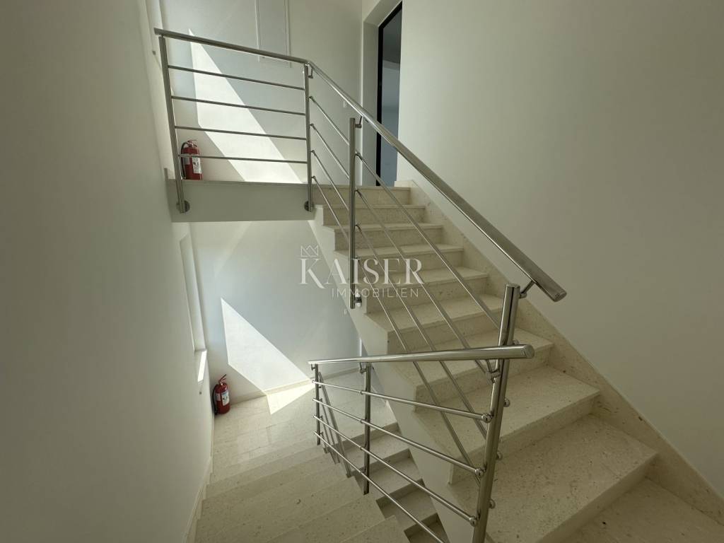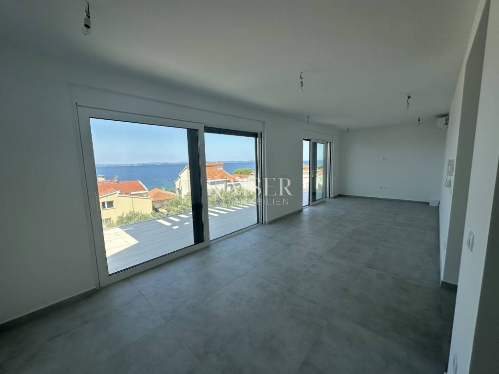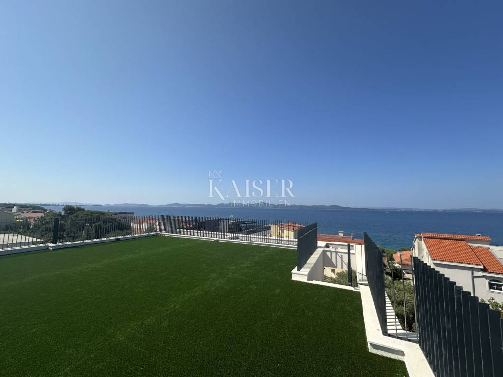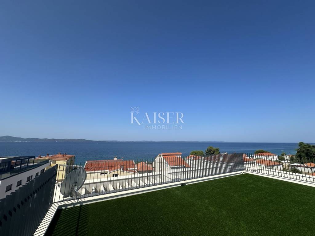 Kaiser Immobilien presents an exclusive penthouse apartment in a modern building in Kožino, located just 90 meters from the sea, with an impressive 101 m² roof terrace offering panoramic views of the sea and the Zadar archipelago. This unique property offers a combination of luxury, privacy and an exceptional location. Kožino is a quiet and attractive village just a ten-minute drive from Zadar, known for its untouched nature, crystal clear sea and well-maintained beaches. This property represents the perfect combination of luxury, privacy and a prime location - ideal for family life, vacation or as an investment for tourist rental. The apartment covers 124 m² of living space and consists of a spacious living room with kitchen and dining room, three bedrooms (the main one has its own bathroom and walk-in closet), and an additional bathroom. The living room opens onto a balcony, and an internal staircase leads to a private roof terrace with a jacuzzi, which is ideal for sunbathing, socializing, relaxing and installing an outdoor kitchen. The floor plan with the layout and areas is among the pictures. The apartment also has a storage room in the basement of the building, as well as two private parking spaces. It was built with top-quality materials and equipped for maximum comfort - thermal facade, underfloor heating in the bathrooms and living room, air conditioning in all rooms, top-quality exterior joinery with triple-layered glass, electric shutters and built-in mosquito nets. This property represents a great opportunity for anyone looking for a spacious apartment with a beautiful view, in the immediate vicinity of the sea. The agency commission for the buyer is 3% + VAT and is paid in the case of purchasing the property, upon conclusion of the first legal act. Contact us with confidence for more information and to arrange a viewing. Tel: +385915404646 Email: vedran@kaiser-immobilien.hr