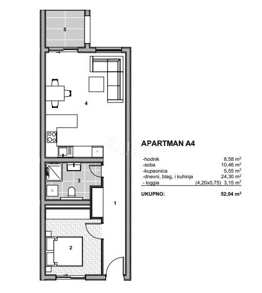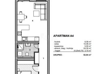 Kaiser Immobilien is proud to offer a modern luxury apartment complex located in the quiet area of Arbanija on Ciovo, just 4 kilometers from the historic town of Trogir. Trogir and Ciovo are the perfect combination of history and nature. Trogir, a beautiful town under UNESCO protection, offers a rich cultural heritage and charming stone streets. Ciovo, connected by a bridge, is known for its clean beaches and crystal clear sea - ideal for a relaxing holiday. Apartments in this area guarantee an authentic Mediterranean experience close to all amenities as well as the proximity of Split Airport, only 5 km away. 1-bedroom, 2-bedroom and 3-bedroom apartments with gardens, balconies and roof terraces are available in all buildings of this prestigious project. Each apartment offers panoramic sea views, is modernly designed with an emphasis on functionality and aesthetics, and is equipped with top-quality materials: aluminum joinery, sliding glass walls, sunshades, underfloor heating and quality insulation that enables energy class A+. The buildings are built to the highest standards using advanced modular Plastbau technology, which additionally guarantees superior resistance, safety and energy efficiency. The settlement is designed as a combination of luxury and homely warmth, with a "turnkey" option, where the buyer can choose a fully furnished and equipped apartment. Parking is provided - underground or outdoor parking space depending on the unit. The project is located in a peaceful Mediterranean environment, while offering excellent connections to Split, the airport and other important facilities. It is ideal for private buyers, but also as an investment - with the possibility of joining a professionally managed tourist rental system with a complete reservation, reception and maintenance service, without any involvement of the owner with a guaranteed return on investment of 4%. We also highlight APARTMENT A4 from the offer, the perfect solution for couples or individuals who want quality space in a modern building by the sea. The apartment consists of: hallway (8.58 m²), one bedroom (10.46 m²), bathroom (5.55 m²), spacious living room with kitchen and dining room (24.30 m²), and a covered loggia (calculated 3.15 m²) for enjoying the outdoors. The total calculated area of the apartment is 52.04 m², and thanks to its modern design and high-quality workmanship, it provides exceptional comfort for year-round living or for use for tourist purposes. The agency commission for the buyer is 3% + VAT and is paid in the case of purchasing a property, upon conclusion of the first legal act. Contact us with confidence for more information and to arrange a viewing. Tel: +385915404646 Email: vedran@kaiser-immobilien.hr