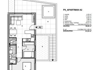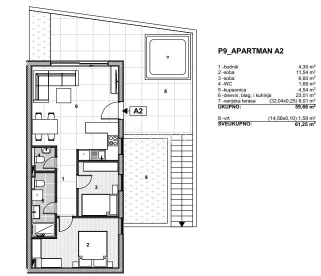 Kaiser Immobilien is proud to offer a modern luxury apartment complex located in the quiet area of Arbanija on Ciovo, just 4 kilometers from the historic town of Trogir. Trogir and Ciovo are the perfect combination of history and nature. Trogir, a beautiful town under UNESCO protection, offers a rich cultural heritage and charming stone streets. Ciovo, connected by a bridge, is known for its clean beaches and crystal clear sea - ideal for a relaxing holiday. Apartments in this area guarantee an authentic Mediterranean experience close to all amenities as well as the proximity of Split Airport, only 5 km away. 1-bedroom, 2-bedroom and 3-bedroom apartments with gardens, balconies and roof terraces are available in all buildings of this prestigious project. Each apartment offers panoramic sea views, is modernly designed with an emphasis on functionality and aesthetics, and is equipped with top-quality materials: aluminum joinery, sliding glass walls, sunshades, underfloor heating and quality insulation that enables energy class A+. The buildings are built to the highest standards using advanced modular Plastbau technology, which additionally guarantees superior resistance, safety and energy efficiency. The settlement is designed as a combination of luxury and homely warmth, with a "turnkey" option, where the buyer can choose a fully furnished and equipped apartment. Parking is provided - underground or outdoor parking space depending on the unit. The project is located in a peaceful Mediterranean environment, while offering excellent connections to Split, the airport and other important facilities. It is ideal for private buyers, but also as an investment - with the possibility of joining a professionally managed tourist rental system with a complete reservation, reception and maintenance service, without any involvement of the owner with a guaranteed return on investment of 4%. We also highlight P9_APARTMENT A2, located on the ground floor with a functional layout and a large private outdoor space. The apartment consists of: hallway (4.30 m²) two bedrooms (11.54 m² and 6.60 m²) toilet (1.66 m²) bathroom (4.54 m²) spacious living room with dining room and kitchen (23.01 m²) outdoor terrace with a calculated area of 8.01 m² (actual area: 32.04 m²) private garden with a calculated area of 1.59 m² (actual area: 14.58 m²) The total calculated area is 61.25 m², and the combination of indoor and outdoor space makes this apartment extremely attractive for living or tourist rental. The private terrace and garden with a total actual area of 46.62 m² provide additional comfort and the opportunity to enjoy the outdoors. The agency commission for the buyer is 3% + VAT and is paid in the case of purchasing a property, upon conclusion of the first legal act. Contact us with confidence for more information and to arrange a viewing. Phone: +385915404646 Email: vedran@kaiser-immobilien.hr