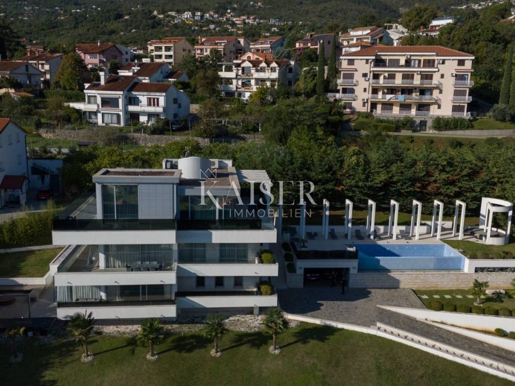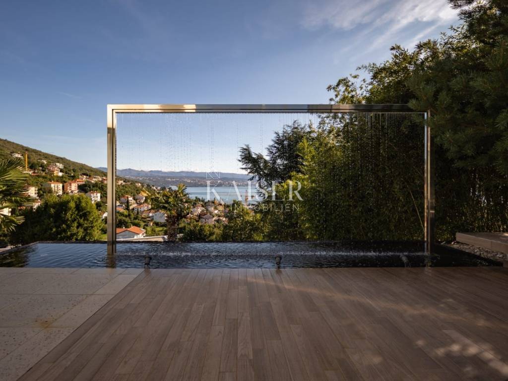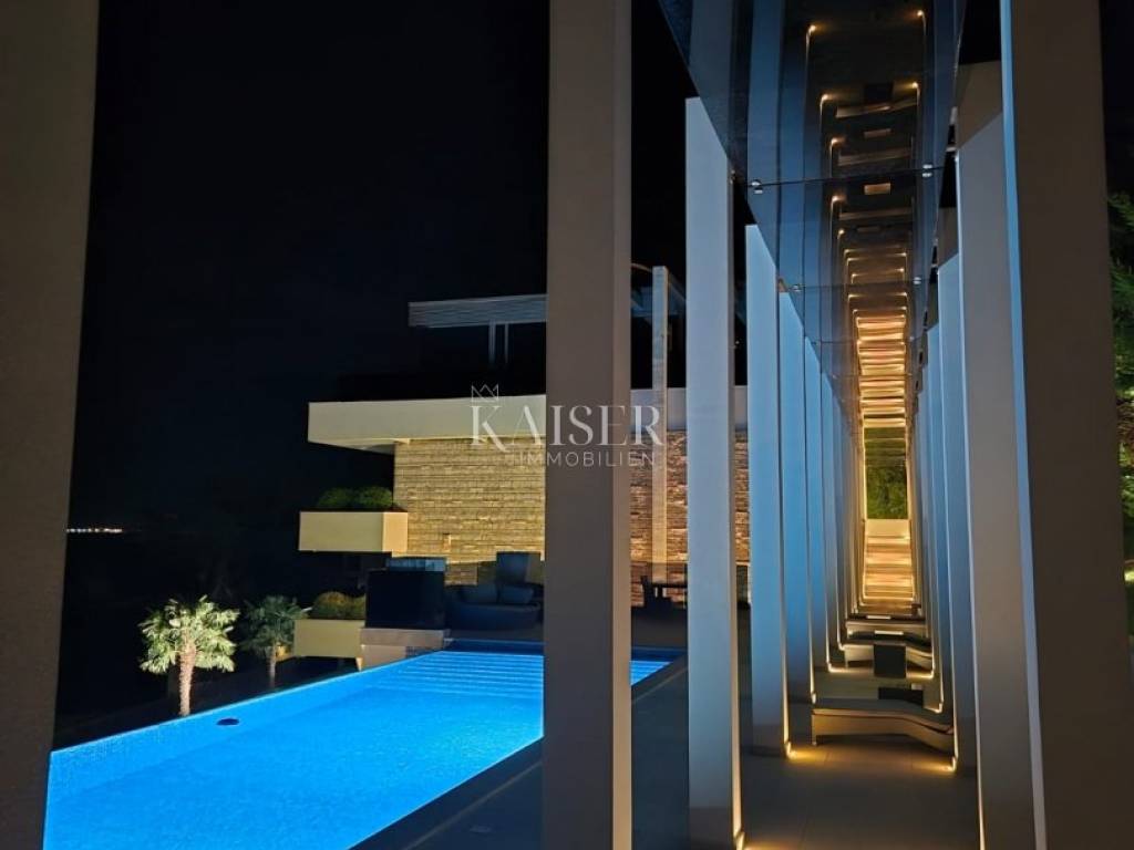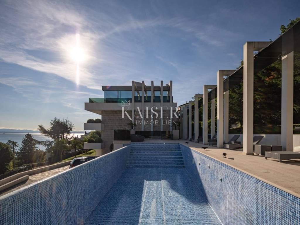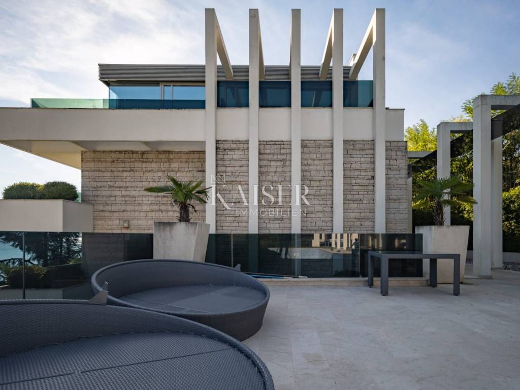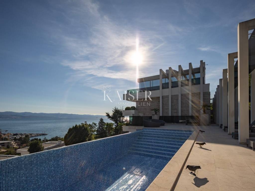 EXCLUSIVE OFFER: We present to you one of the most prestigious villas in Kvarner, located in the elite location of Ičići, just 150 meters from the sea. This luxurious residence with modern and attractive architecture offers a phenomenal, unobstructed view of the entire Kvarner Bay. Luxury and Design Villa This exceptional architectural beauty is located on the slopes above the famous marina in Ičići. Its uniqueness lies in the integrated approach to decoration and design down to the smallest detail. The villa has been recognized and awarded with all prestigious architectural awards, which confirms its exceptional value. • Villa: Area 600 m². • Land: Beautifully landscaped land of 2,300 m². • Exterior: Beautiful Mediterranean garden, porch and gazebo with lounge area by the infinity pool and sunbathing area. The garden is enriched with 260 French cypresses and Japanese bamboos. Layout and Amenities (3 Floors with Internal Elevator) 1. Ground Floor – SPA & Entertainment: o Complete SPA zone with swimming pool, sauna and fitness. o Access to a spacious terrace with a special “shower wall” that creates a unique atmosphere at night. o One bedroom with en-suite bathroom. o Wine cellar with cigar room. 2. First Floor – Living Area: o Spacious open space living room with kitchen and dining area, with access to terraces with sea view. o Two bedrooms with en-suite bathrooms, separate bathroom, toilet and dressing room. 3. Second Floor – Master Area: o Master bedroom with en-suite bathroom and dressing room and access to a large terrace. o Another bedroom with its own bathroom and terrace. Equipment That Sets Standards The interior is adorned with pastel colors and tones complemented by the highest quality materials: • SMART HOME management system. • Central underfloor heating and air conditioning. • Listone Giordano parquet (length 1.5-2 m) in the living room and bedrooms. • Cotto d'Este stone and Burmese teak in the wellness area. • Luxury lighting fixtures by iGuzzini. • Two-car garage (54 m²) and state-of-the-art video surveillance and alarm system.
