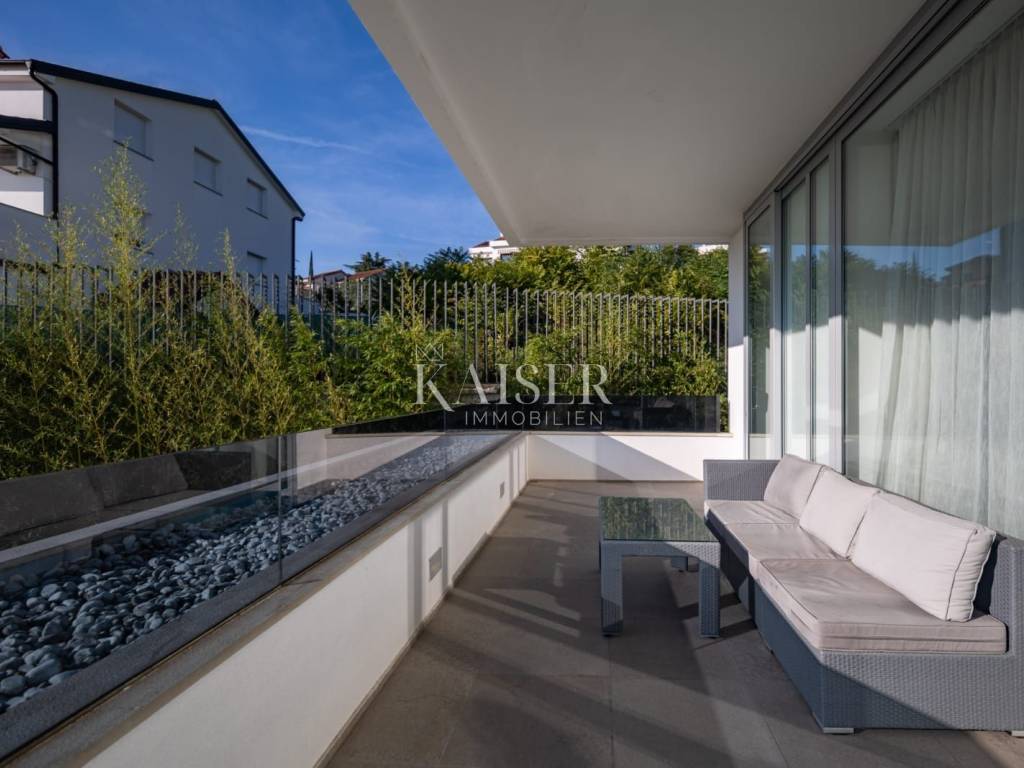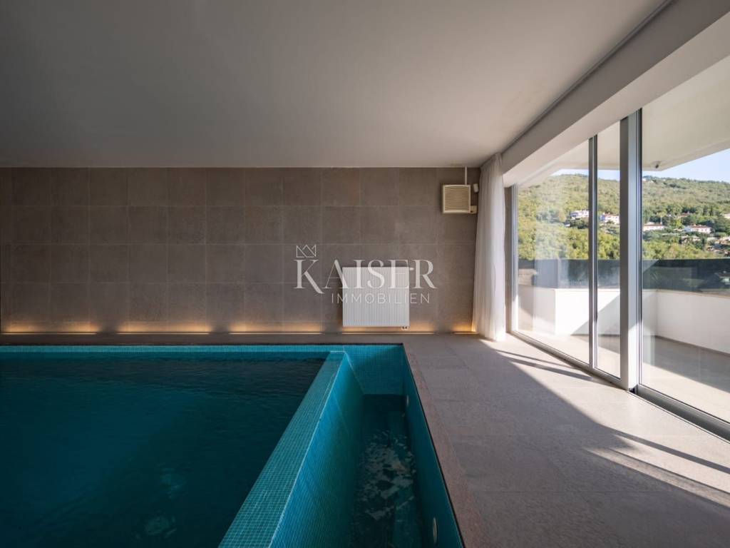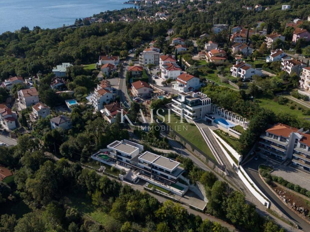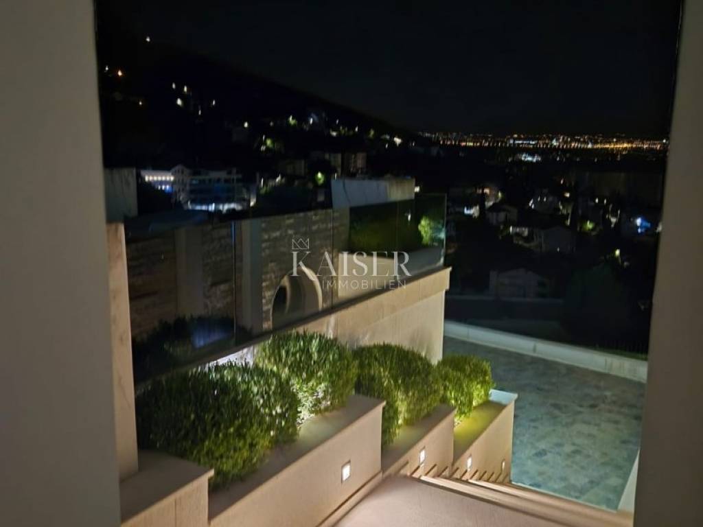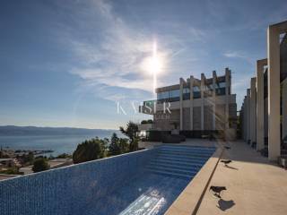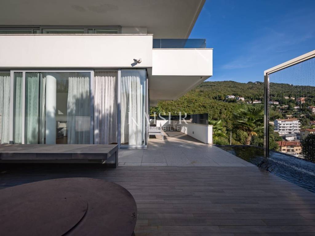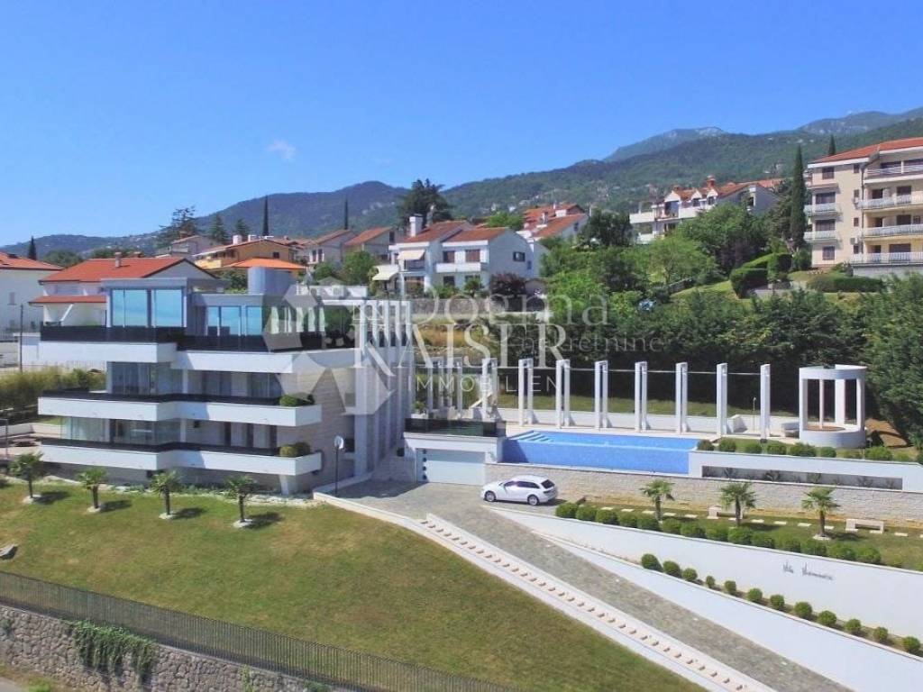EXCLUSIVE OFFER: We present to you one of the most prestigious villas in Kvarner, located in the elite location of Ičići, just 150 meters from the sea. This luxurious residence with modern and attractive architecture offers a phenomenal, unobstructed view of the entire Kvarner Bay. Luxury and Design Villa This exceptional architectural beauty is located on the slopes above the famous marina in Ičići. Its uniqueness lies in the integrated approach to decoration and design down to the smallest detail. The villa has been recognized and awarded with all prestigious architectural awards, which confirms its exceptional value. • Villa: Area 600 m². • Land: Beautifully landscaped land of 2,300 m². • Exterior: Beautiful Mediterranean garden, porch and gazebo with lounge area by the infinity pool and sunbathing area. The garden is enriched with 260 French cypresses and Japanese bamboos. Layout and Amenities (3 Floors with Internal Elevator) 1. Ground Floor – SPA & Entertainment: o Complete SPA zone with swimming pool, sauna and fitness. o Access to a spacious terrace with a special “shower wall” that creates a unique atmosphere at night. o One bedroom with en-suite bathroom. o Wine cellar with cigar room. 2. First Floor – Living Area: o Spacious open space living room with kitchen and dining area, with access to terraces with sea view. o Two bedrooms with en-suite bathrooms, separate bathroom, toilet and dressing room. 3. Second Floor – Master Area: o Master bedroom with en-suite bathroom and dressing room and access to a large terrace. o Another bedroom with its own bathroom and terrace. Equipment That Sets Standards The interior is adorned with pastel colors and tones complemented by the highest quality materials: • SMART HOME management system. • Central underfloor heating and air conditioning. • Listone Giordano parquet (length 1.5-2 m) in the living room and bedrooms. • Cotto d'Este stone and Burmese teak in the wellness area. • Luxury lighting fixtures by iGuzzini. • Two-car garage (54 m²) and state-of-the-art video surveillance and alarm system.