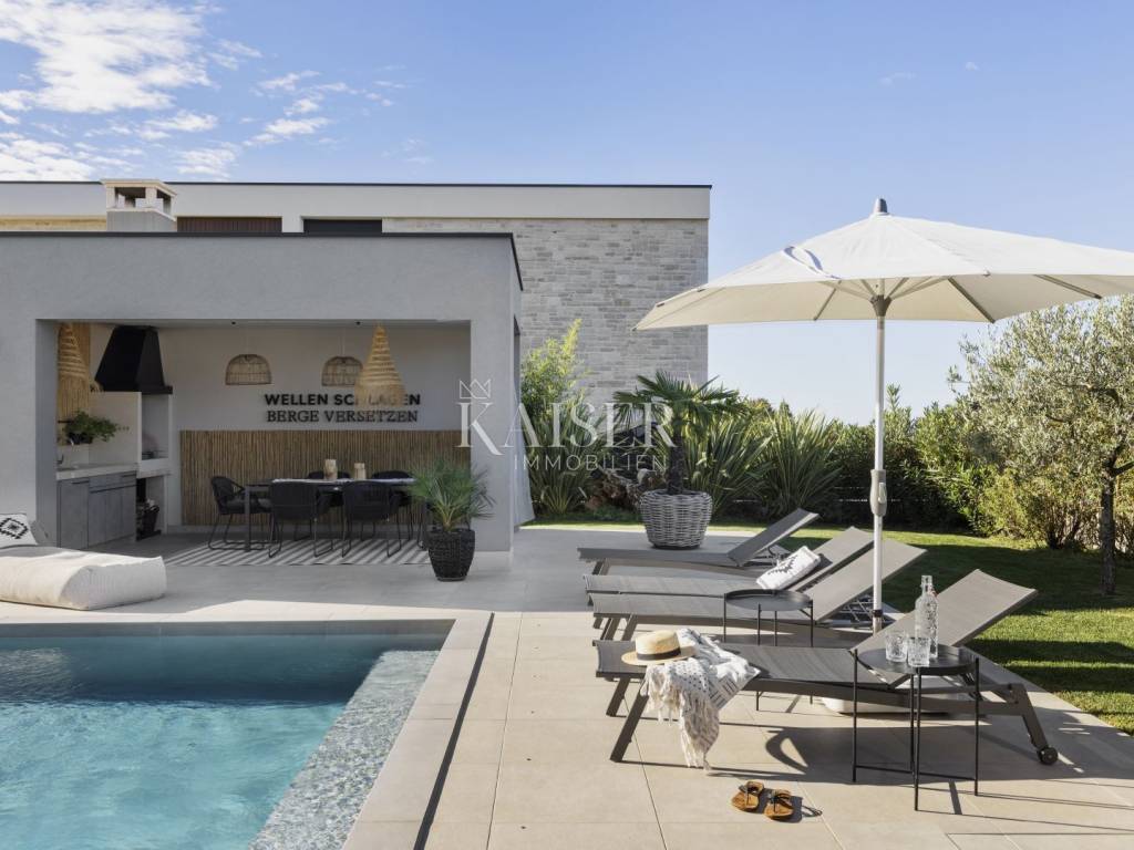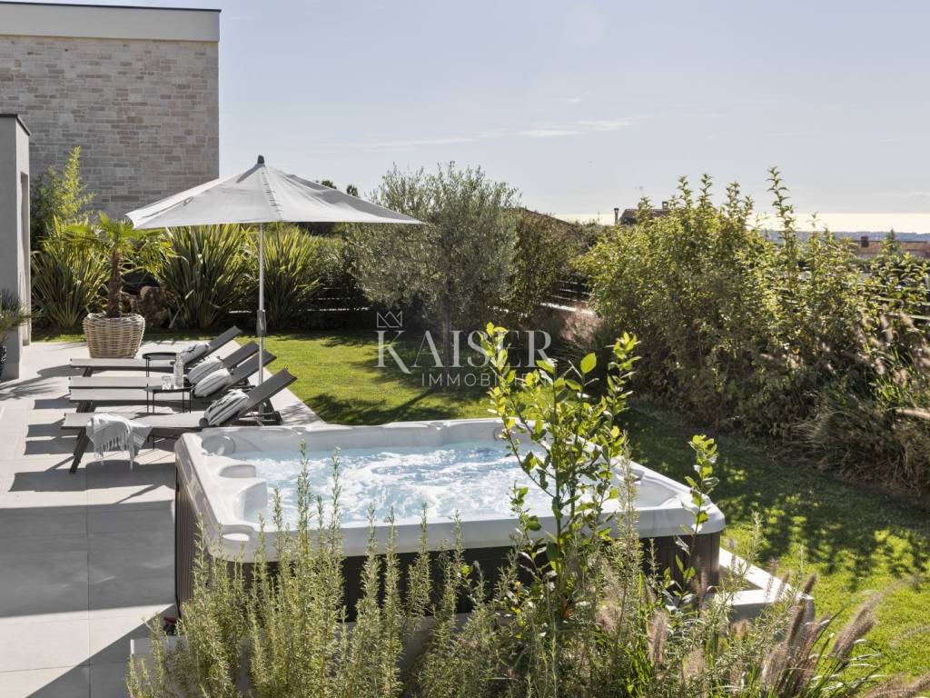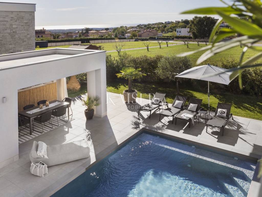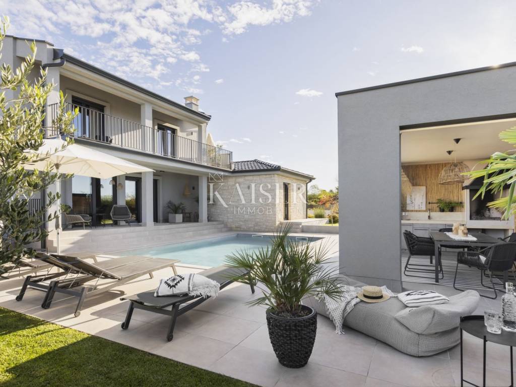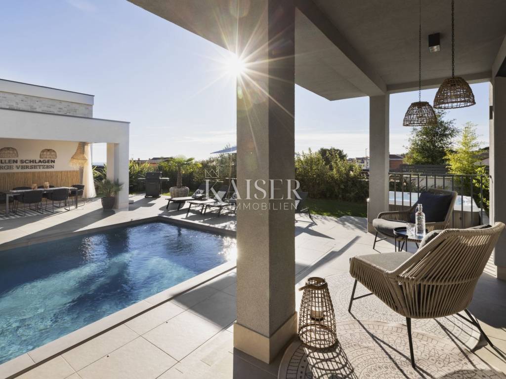 Luxury villa with sea view - fully furnished and ready to enjoy Kaiser Immobilien is proud to present for sale an elegant luxury villa with a breathtaking sea view, located in a quiet and developed area near Poreč. Just a 15-minute drive from the sea and the city center, this property represents the perfect blend of modern design, comfort and Mediterranean charm. The villa is fully furnished and equipped and is being sold in excellent condition, ready to move in or continue a successful tourist rental. The owners have carefully designed and equipped it according to their own ideas, paying attention to every detail - from the selection of materials to decorative elements that give the space warmth and elegance. The property consists of a ground floor and an upper floor, with an additional outdoor relaxation area, sauna and storage space. On the ground floor there is a spacious open-concept living room with a kitchen and dining area that naturally connects to the terrace and pool, an ideal place to enjoy summer days. On the same floor there is a guest toilet, a bedroom with its own bathroom and a technical room equipped with a washing machine, dryer and storage room for maintaining the villa. An elegant wooden staircase leads to the first floor, where there are two more spacious bedrooms, each with its own en suite bathroom and access to a balcony with a magical view of the sea, pool and surrounding nature. The villa is equipped with a heat pump and underfloor heating system, and each room has a separate air conditioning. The carpentry is three-layered and electric, made of top-quality materials that ensure comfort and energy efficiency. There are several parking spaces in the garden, and connection to the city sewer is in progress. Thanks to its excellent location, attractive design and high-quality construction, this villa represents an excellent opportunity for private residence or as an investment for tourist rental. A unique combination of luxury, peace and Mediterranean spirit - your new home by the sea. Dear clients, it is possible to view the property only with a signed brokerage contract, which is the basis for further actions related to the purchase and sale and the collection of commission, all in accordance with the Real Estate Brokerage Act. The KAISER IMMOBILIEN agency, as an authorized real estate broker, charges a brokerage fee of 3% + VAT from the buyer and seller for the brokerage service at the time of concluding the Preliminary Agreement or Purchase Agreement. Telephone: 00385923782803 Email address: ivana@kaiser-immobilien.hr. Seller: Ivana Gašparini.