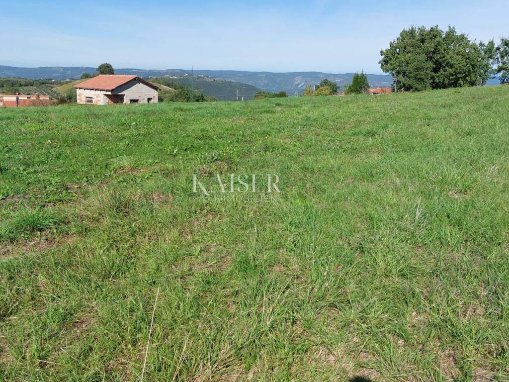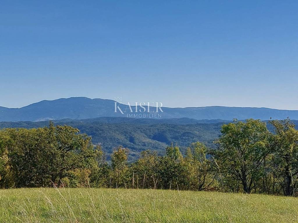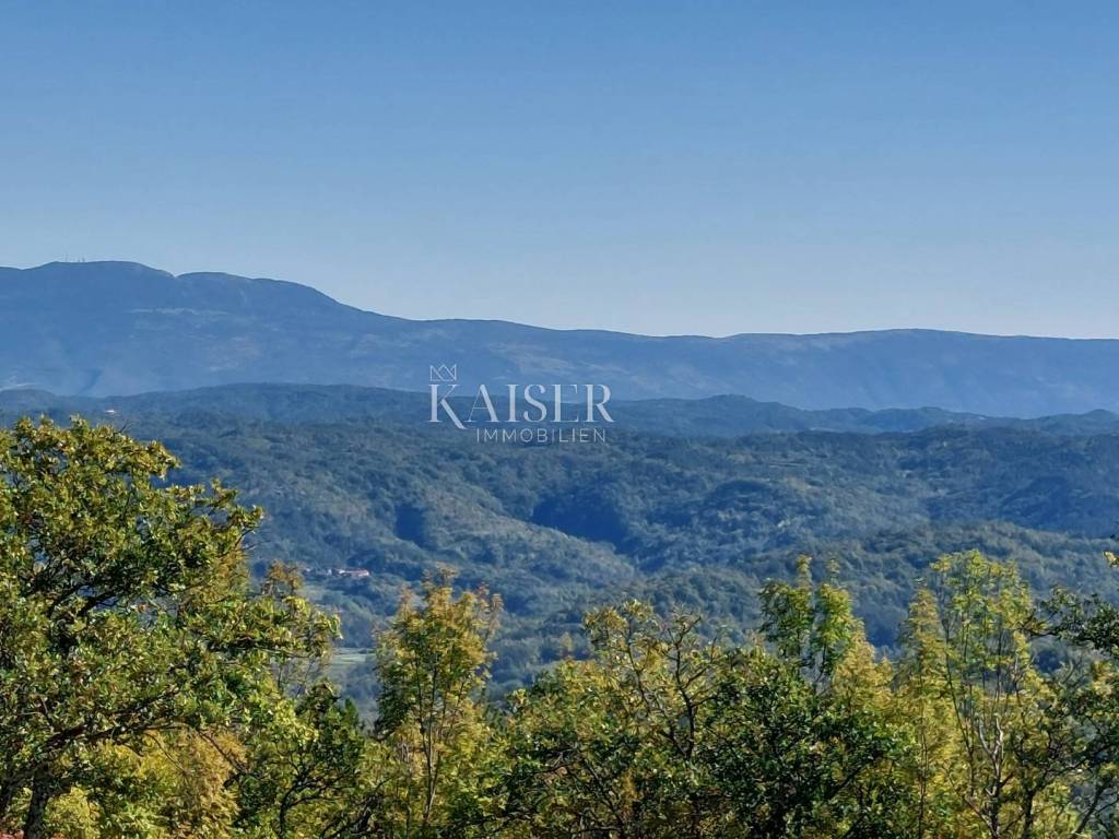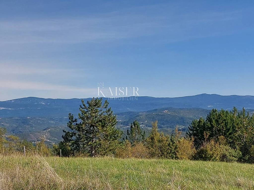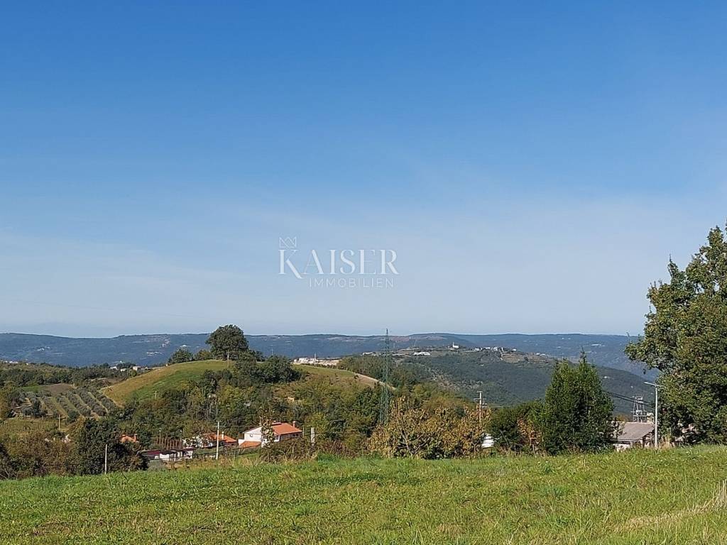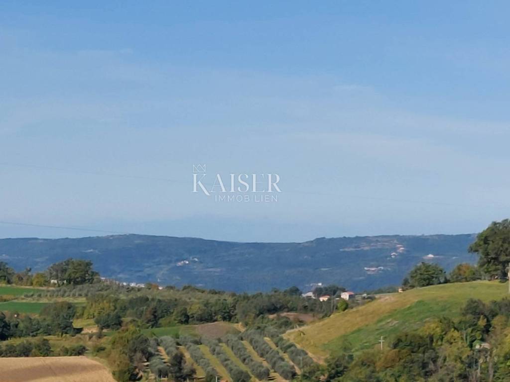 Kaiser Immobilien presents a unique project with a view of the entire central Istria. The location of this luxury project is in the central part of Istria, more precisely a small town above Lake Butoniga and near the beautiful Motovun, a popular tourist destination. These lands are slightly separated from the town itself, which gives them a very peaceful and relaxed atmosphere. We can call this project a refuge in peaceful nature. Land for three modern villas with a pool on a beautiful hill, at 460 m above sea level with a 360-degree view of the Istrian landscape on one side, and Učki on the other, Istria is literally in the palm of your hand. On building plots of 1,370 m2, 1,265 m2 and 1,239 m2, building permits were obtained for family houses of 410 m2 gross area, with a heated pool of 56 m2 gross area. The ground floors are designed as spacious open living rooms, kitchens, dining rooms, which are connected with several glass walls to the exterior where there are beautiful multi-level swimming pools. In that ground floor there is also a wellness area. The sleeping area is designed in "towers" on the first and second floor, in six sleeping units, each with its own bathroom. Each bedroom will be designed for comfort and peace, offering stunning views of the landscape. From the "towers", in addition to the beautiful view of the outside landscape, an inward view of the green extensive roof that covers the first floors is envisioned. The overall interior is designed in a very modern way, while still following the basic ideas of the Istrian region. All expenses are paid, and construction can start immediately. The owner has all offers for the completion of the construction, including horticulture and interior decoration. It is planned to build houses with floors P+2, with a large living room and kitchen, a wellness/sauna area, and a total of 6 bedrooms (2 master bedrooms), each with its own bathroom. Heating and cooling will be provided by a heat pump that will be connected to underfloor heating and fan coils. Installation for a photovoltaic power plant (solar panels) to produce electricity is planned. These modern villas, apart from the basic things it will have premium amenities such as smart homes, climate control and security measures to ensure comfortable and safe living.Access is from an asphalt road with sewerage infrastructure underneath. 4 parking spaces are provided on the plots. For all information, contact your agent.