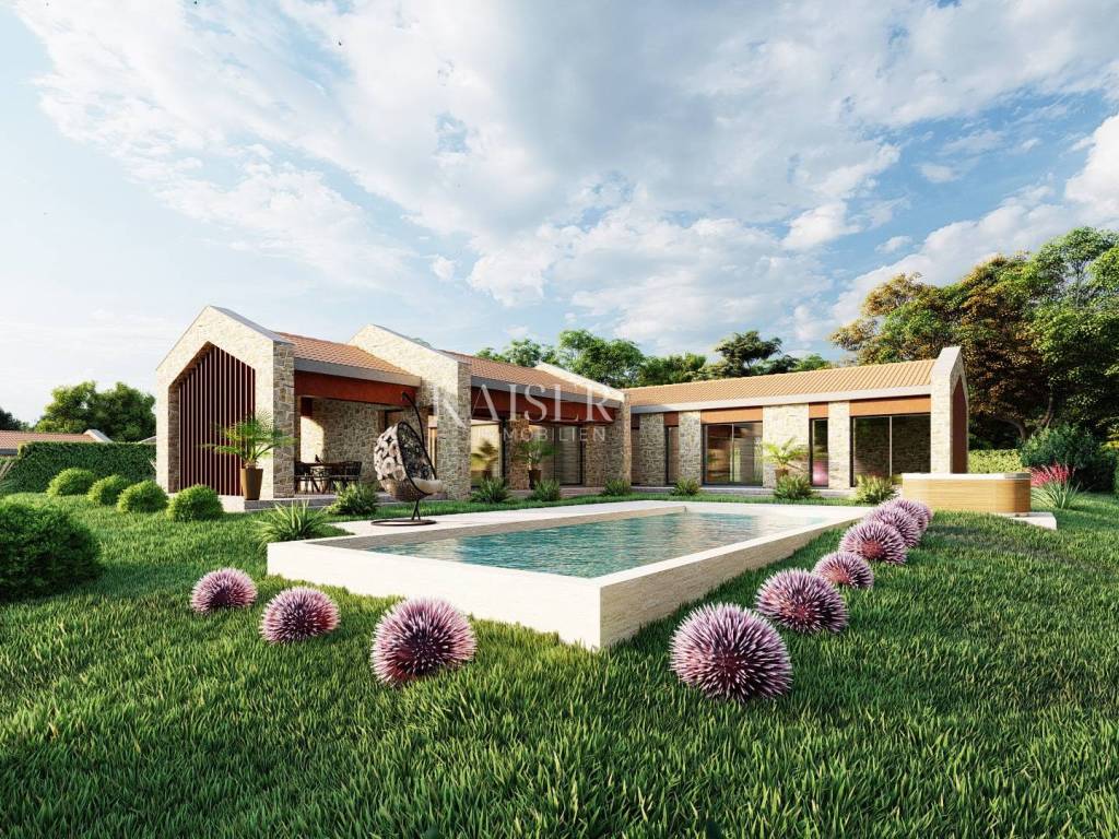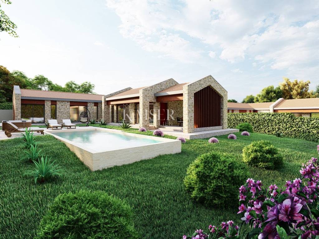 Kaiser Immobilien is selling land with a building permit for a house with a swimming pool, total area 1046 m2. The land is located in a small, quiet village with several houses, 7 km from Motovun. In addition to numerous cultural and historical sights, Motovun is known for its good restaurants and famous winemakers. Motovun and its surroundings can boast numerous vineyards, recreational facilities that enable active vacations such as grape harvesting, asparagus picking, truffle digging, fishing and many other activities. A house with a net area of 122 m2 and a swimming pool of even 50 m2 will be built on the land. The ground floor contains a kitchen, dining room and living room with access to a covered terrace, entrance area, hallway, bathroom, engine room/laundry room, two bedrooms, each with its own bathroom and a third room that the investor can arrange as a bedroom, study, playroom or sauna. . All the exterior spaces of the building are oriented NE. The entrance to the house is on the southwest side. Living spaces in the building will be heated and cooled by heat pumps of the air-air system in the design of a multi-split system with external and internal units, with distribution of the working medium (R410 A, R32, ...). Hot water consumption will be solved by installing a central electric boiler with an integrated heat pump. Proximity to all amenities and excellent connectivity make this location extremely practical and attractive for everyday life or as an investment. (Karojba 3km, Motovun 7km, Poreč 20km) There is a possibility of buying neighboring land with a similar project, providing additional flexibility in planning. The intermediary commission of the agency for the buyer is 3% + VAT. You can contact us for all information.