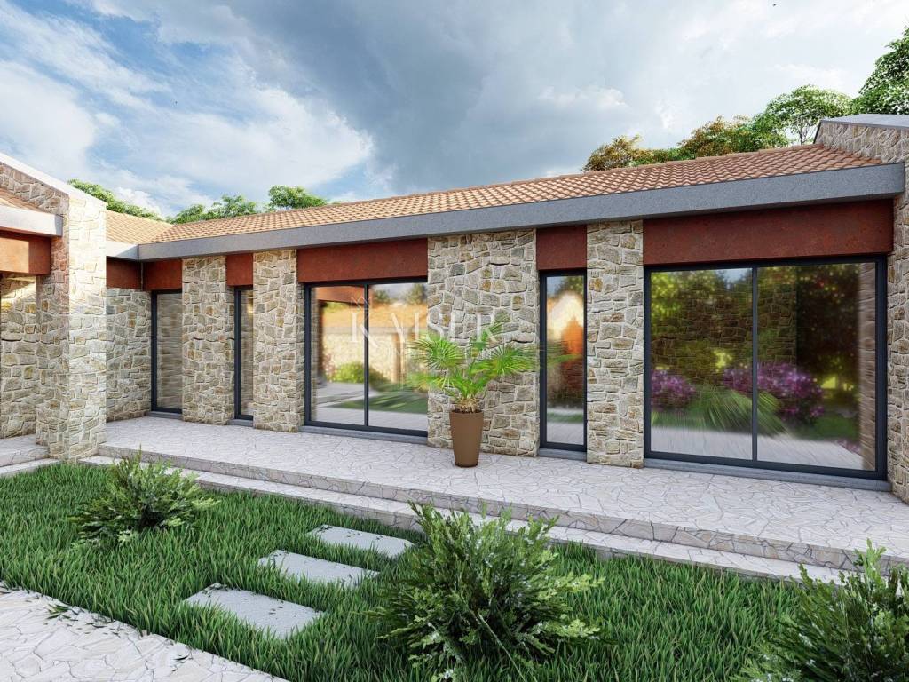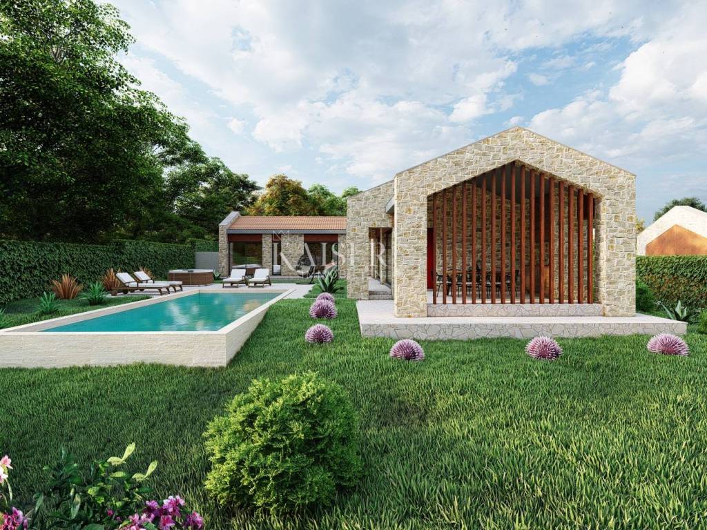 Kaiser Immobilien is selling land with a building permit for a house with a swimming pool, total area 1146 m2. (V 2) This regular-shaped plot of land is located in a small, quiet village with a few houses, 7 km from Motovun. In addition to numerous cultural and historical sights, Motovun is known for its good restaurants and famous winemakers. Motovun and its surroundings can boast numerous vineyards, recreational facilities that enable active vacations such as grape harvesting, asparagus picking, truffle digging, fishing and many other activities. A house with a net area of 122 m2 and a swimming pool of even 50 m2 will be built on the land. The ground floor contains a kitchen, dining room and living room with access to a covered terrace, entrance area, hallway, bathroom, engine room/laundry room, two bedrooms, each with its own bathroom and a third room that the investor can arrange as a bedroom, study, playroom or sauna. . All the exterior spaces of the building are oriented NE. The entrance to the house is on the southwest side. Living spaces in the building will be heated and cooled by heat pumps of the air-air system in the design of a multi-split system with external and internal units, with distribution of the working medium (R410 A, R32, ...). Hot water consumption will be solved by installing a central electric boiler with an integrated heat pump. The infrastructure is located next to the land. Proximity to all amenities and excellent connectivity make this location extremely practical and attractive for everyday life or as an investment. (Karojba 3km, Motovun 7km, Poreč 20km) There is a possibility of buying neighboring land with a similar project, providing additional flexibility in planning. The intermediary commission of the agency for the buyer is 3% + VAT. You can contact us for all information.