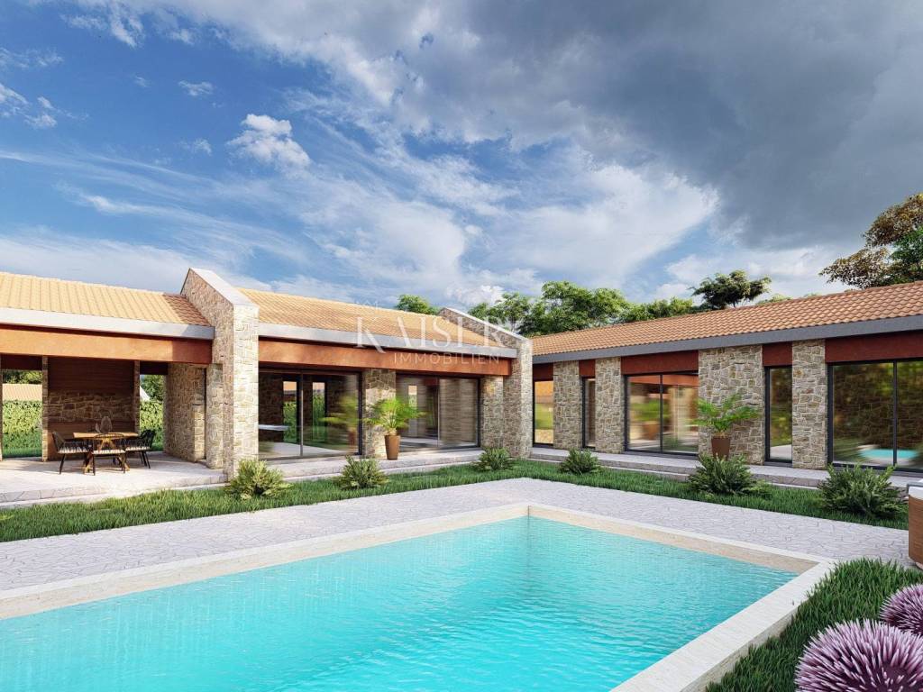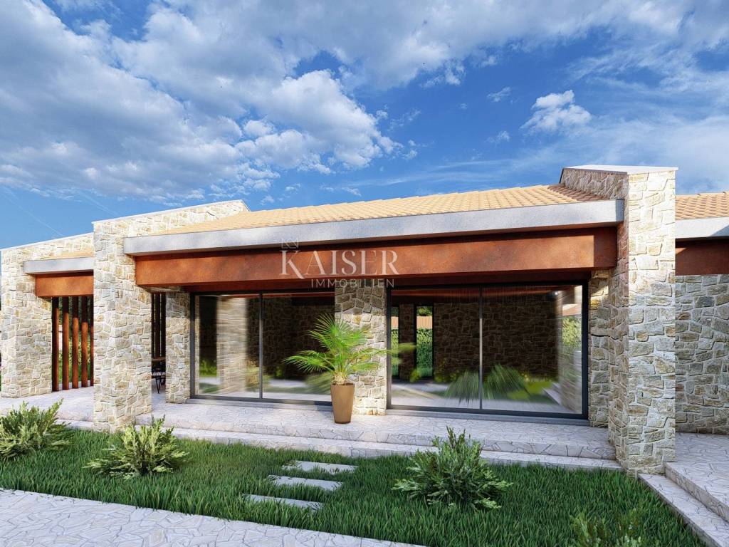 Kaiser Immobilien is selling land with a building permit for a house with a swimming pool, total area 1215 m2. (V 3) This regular-shaped plot of land is located in a small, quiet village with a few houses, 7 km from Motovun. In addition to numerous cultural and historical sights, Motovun is known for its good restaurants and famous winemakers. Motovun and its surroundings can boast numerous vineyards, recreational facilities that enable active vacations such as grape harvesting, asparagus picking, truffle digging, fishing and many other activities. A house with a net area of 124 m2 and a swimming pool of even 50 m2 will be built on the land. The ground floor contains a kitchen, dining room and living room with access to a covered terrace, entrance area, hallway, bathroom, engine room/laundry room, two bedrooms, each with its own bathroom and a third room that the investor can arrange as a bedroom, study, playroom or sauna. . All the exterior spaces of the building are oriented SW. The entrance to the house is on the northwest side. Living spaces in the building will be heated and cooled by heat pumps of the air-air system in the design of a multi-split system with external and internal units, with distribution of the working medium (R410 A, R32, ...). Hot water consumption will be solved by installing a central electric boiler with an integrated heat pump. The infrastructure is located next to the land. Proximity to all amenities and excellent connectivity make this location extremely practical and attractive for everyday life or as an investment. (Karojba 3km, Motovun 7km, Poreč 20km) There is a possibility of buying neighboring land with a similar project, providing additional flexibility in planning. The intermediary commission of the agency for the buyer is 3% + VAT. You can contact us for all information.