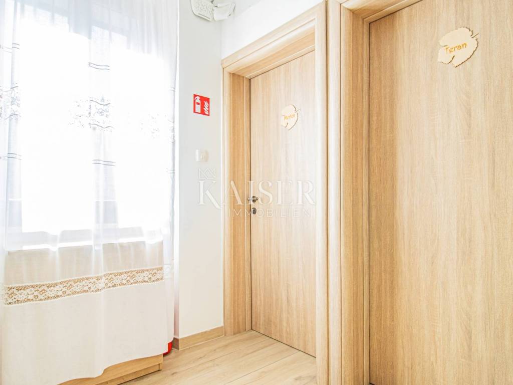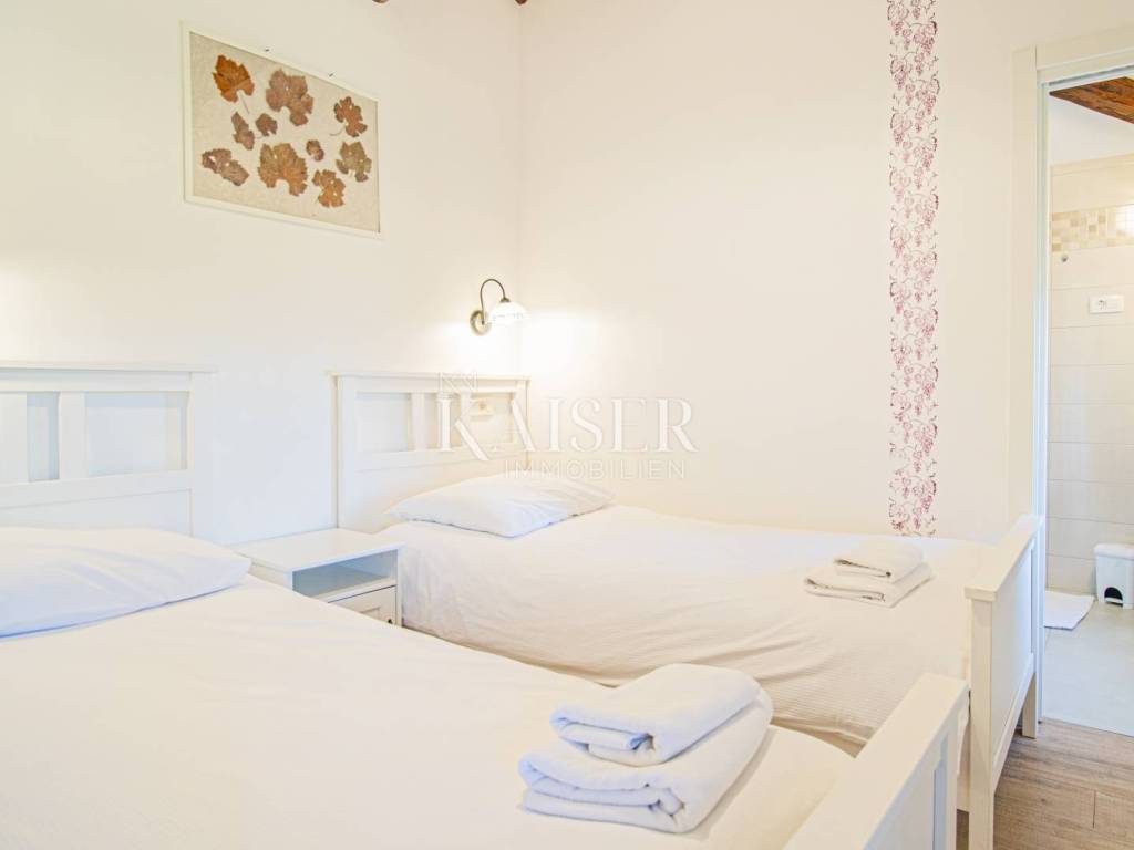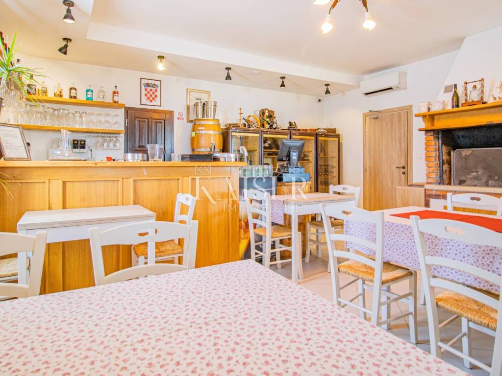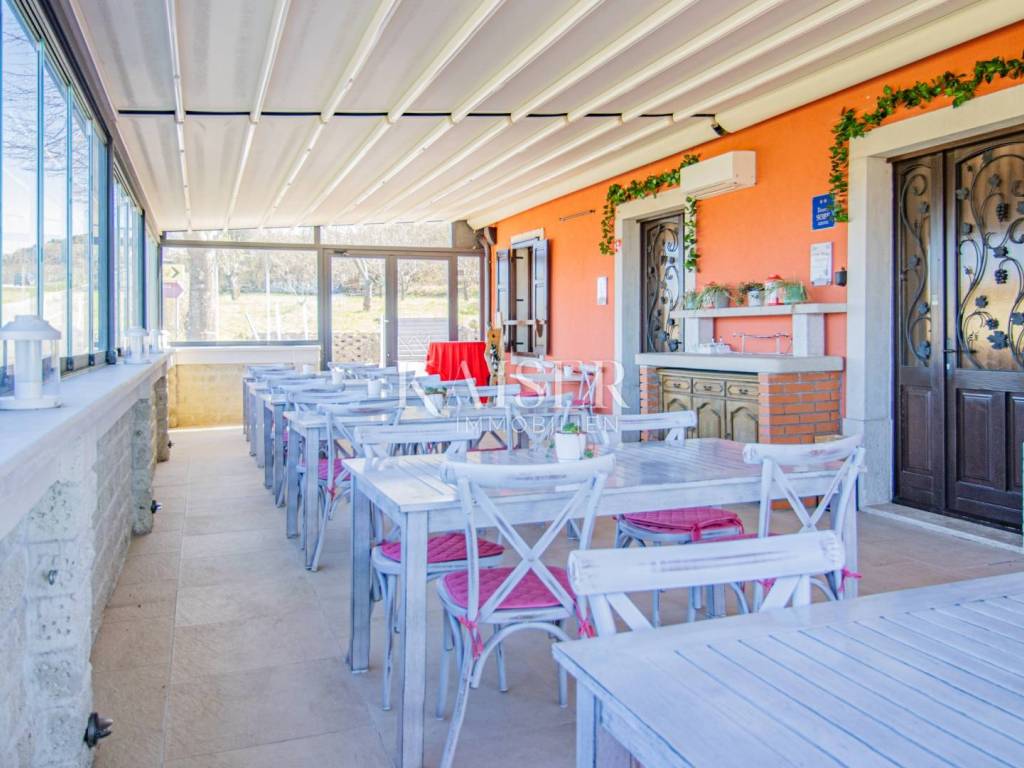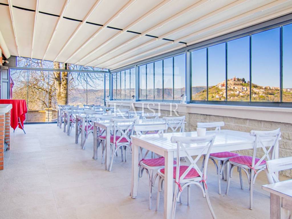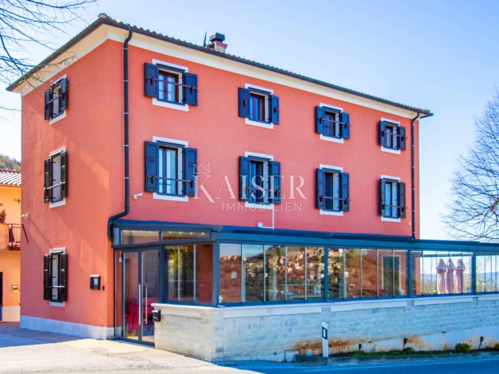 Kaiser Immobilien presents a unique hospitality facility near Motovun. This extraordinary hospitality facility is located near the beautiful medieval town of Motovun, one of the most famous and most beautiful towns in Istria, known for its top-notch restaurants, famous winemakers, and rich history and culture. The surroundings of Motovun offer numerous historical sights, cultural attractions, as well as activities such as hiking, cycling... - ideal for a perfect active vacation. This facility, built in 1910, underwent a complete renovation and adaptation in 2018 according to modern tourism standards. With catering facilities, a kitchen, a wine cellar and charming rooms, the facility is ready for year-round operation and service to its guests. The main entrance to the facility leads through a spacious enclosed terrace, which is equipped with large windows that provide a spectacular view of Motovun and the surrounding nature. The terrace is enriched with a movable pergola, which is perfect for enjoying in all seasons, whether summer or winter, because the terrace has its own heating and air conditioning system. There are two entrances to the property from the terrace: one leads to a charming hall with a wine bar, while the other leads to a hallway with a staircase leading to the upper floors. At the other end of the hallway is the reception area, as well as male and female toilets, the entrance to the kitchen and access to the staff leading to the hall. The reception area also includes an office and an entrance to the basement. In the basement, which is reached by stairs, there is a tasting room and a wine bank, as well as a pantry. This space provides the perfect opportunity for storing and tasting wine, with the possibility of organizing wine tours and events. The entrance to the basement is also possible through a pantry with a door leading to the back of the property, which facilitates access for deliveries. On the upper floors of the property there are a total of 8 bedrooms. Of these, 4 double rooms and 4 single rooms, each with its own bathroom and a beautiful view of the surroundings. The rooms are air-conditioned, providing maximum comfort for all guests. The property is equipped with a modern water filtration system (depurator) that provides access to soft water, and a heating and cooling system via air conditioners. Additionally, the fireplace in the main hall provides additional warmth on colder days, while solar panels ensure environmentally friendly water heating. For security, the facility is equipped with video surveillance, and internet access is provided throughout. In addition to the catering facility, the sale also includes an orchard of 1028 m² located on construction land, with a direct connection to the infrastructure. This space can be used for further development of the facility, construction of additional facilities, expansion of business through the organization of events... This catering facility, located in one of the most attractive destinations in Istria, is an ideal opportunity for all those who want to invest in tourism and catering. With modern facilities, beautiful views, business potential, this fully equipped and functional facility offers everything needed for a successful business venture. Distance to the property: Pula Airport - 68 km Zagreb Airport - 237 km Ljubljana - 134 km Vienna - 515 km Prague - 786 km Munich - 539 km The buyer's brokerage fee is 3% + VAT. The fee covers all services related to the purchase and is paid only in the case of real estate purchase, when concluding the first legal transaction. For more information or to schedule an inspection, feel free to contact our agent at +385(0)98339933 or via e-mail: damir@kaiser-immobilien.hr.