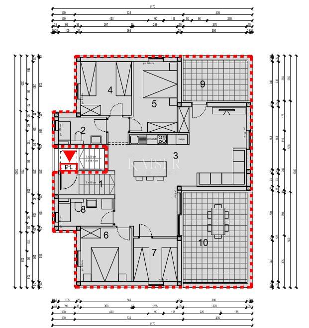 The apartment, marked P1, is located on the second floor of the building and offers a total net usable area of 113.04 m² (including the living area and outdoor areas according to coefficients). The interior living space of 91.30 m² is extremely spacious and functionally arranged, providing maximum comfort for a large family or those who appreciate luxury and space.