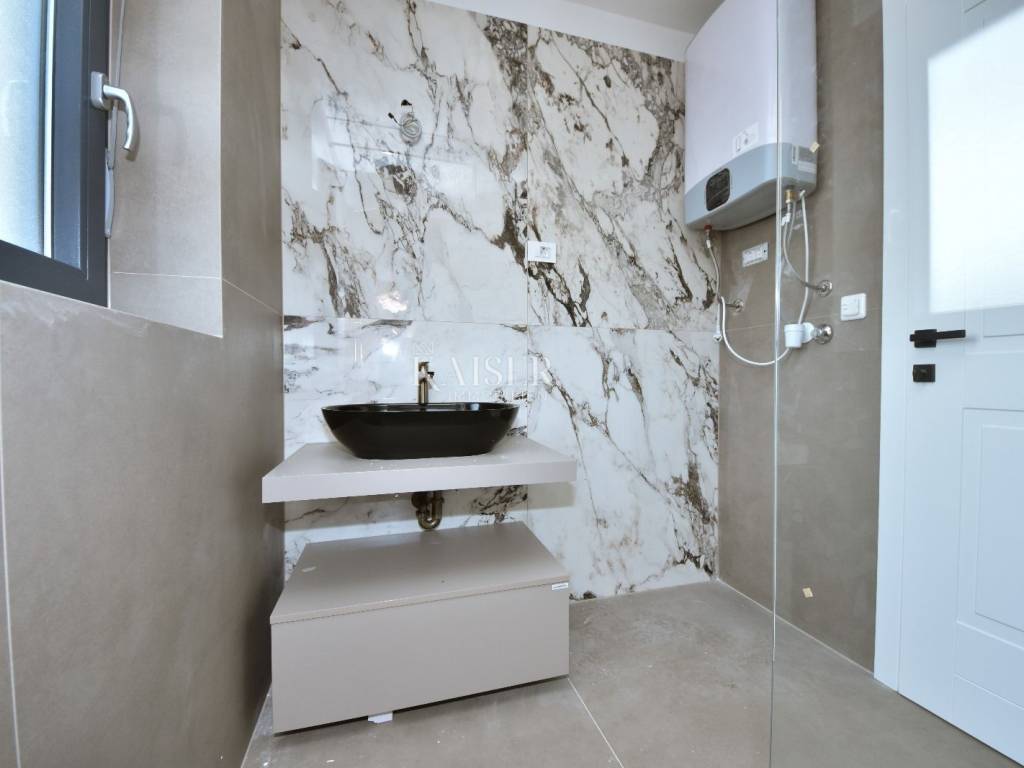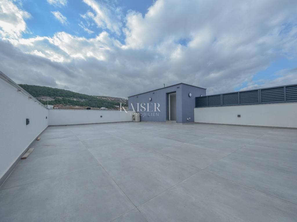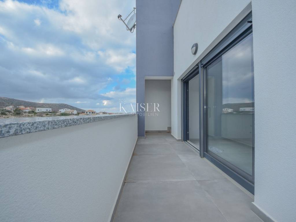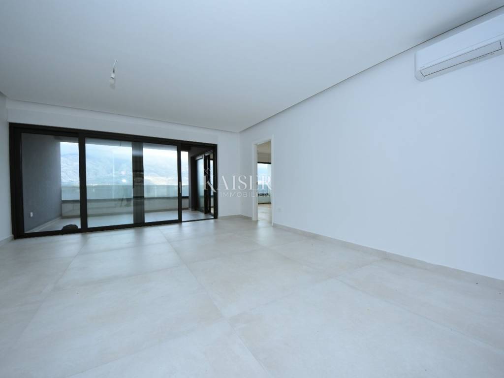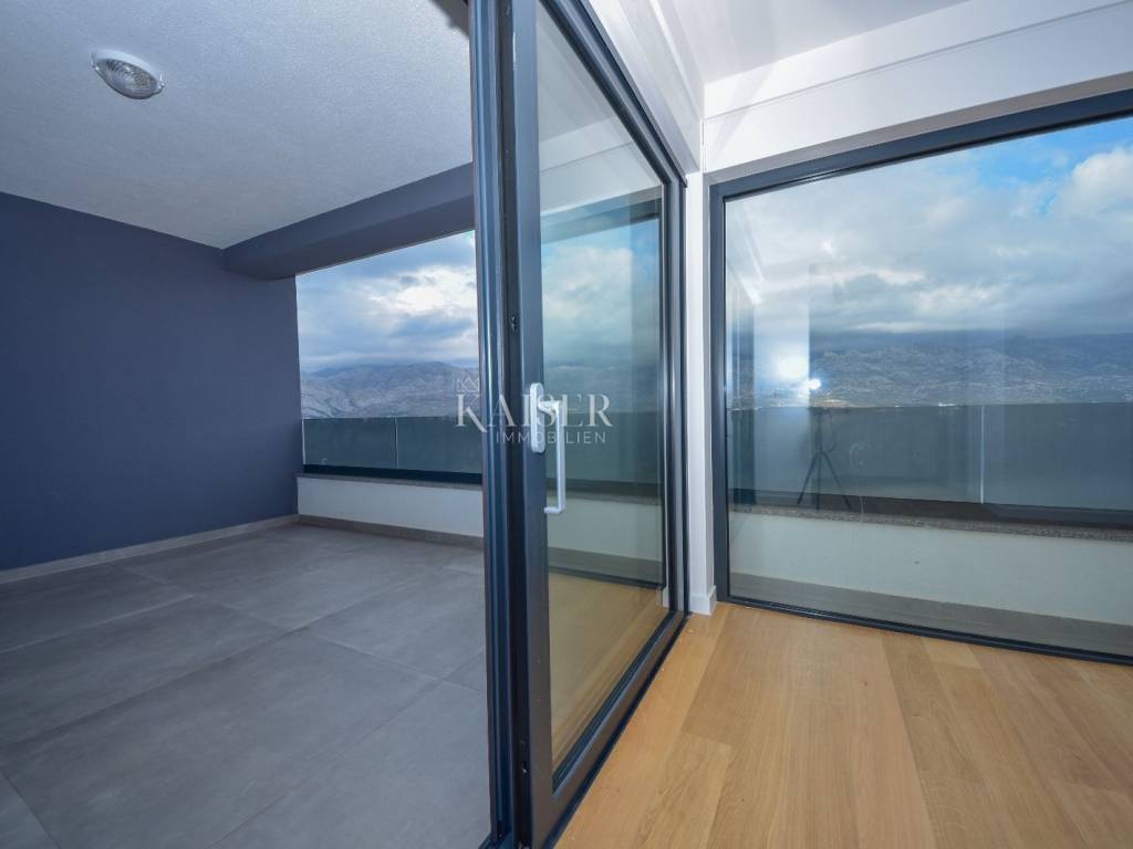 Kaiser immobilien mediates the sale of a luxury penthouse apartment, first row to the sea, in Vinjerac, not far from Zadar. Vinjerac is a picturesque place with a rich maritime tradition and irresistible Mediterranean charm. It is located on a peninsula on the southeast side of the Velebit Channel, about 35 km northeast of Zadar. When you arrive at the place, the panorama you will see will leave you speechless. The apartment with a living area of 134.85 m2 is located on the 1st floor of a newly built building, located in the first row to the sea. It consists of three bedrooms, living room with kitchen and dining room, hallway and two bathrooms. There is also a covered terrace of 14.90 m2, ideal for enjoying summer evenings, and an uncovered terrace of 9 m2 with a glass fence that takes your breath away with its panoramic view of the sea and the Velebit mountain. An additional feature is the roof terrace of 101 m2, which can be reached by an internal staircase, on which there is a swimming pool with a sunbathing area and a shower. In the construction and furnishing, top-quality materials were used, so that the object has built-in high-quality ceramics, underfloor heating is provided by a heat pump, air conditioning in all rooms, massive aluminum carpentry, automatic shutters and mosquito nets. The apartment comes with a parking space. The commission of the agency for the buyer is 3% + VAT and is paid in case of real estate purchase, when the first legal deed is concluded.