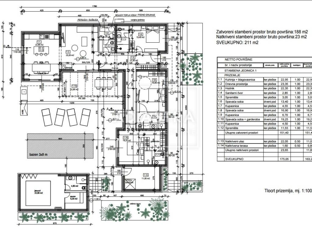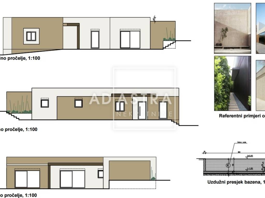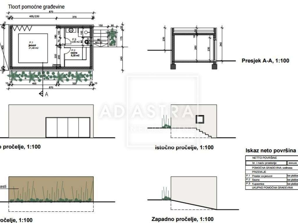 According to the current building permit, the house has a total net area of 163.22 m2 and consists of a spacious open space living area with a kitchen and dining area and access to a covered terrace, three bedrooms with private bathrooms, a storage room, a guest toilet and an additional storage room intended for the pool engine room. In the extension, there is an 8X3 m swimming pool with a sunbathing area and an auxiliary building/wellness of 31.15 m2 with a jacuzzi, sauna and bathroom. Within the garden there is space for two parking spaces.