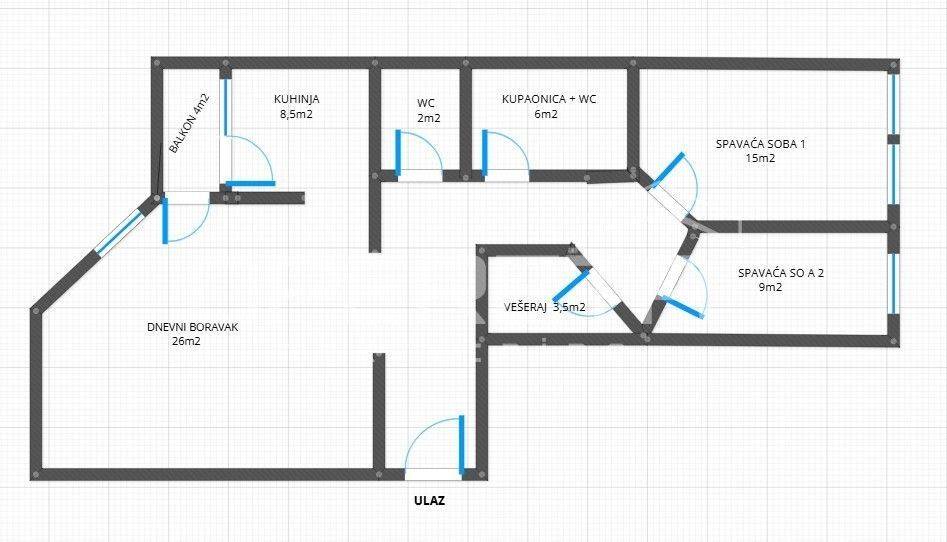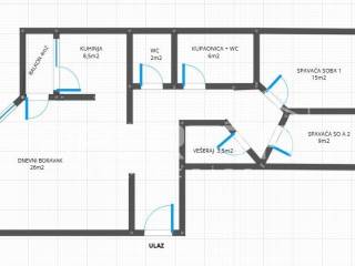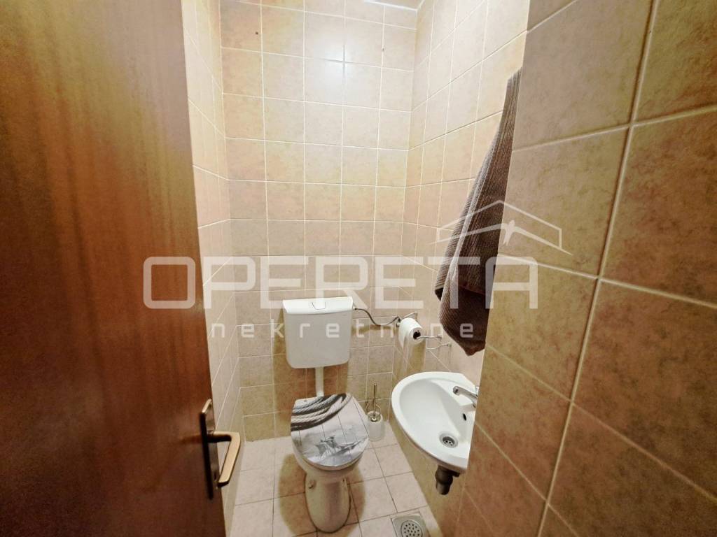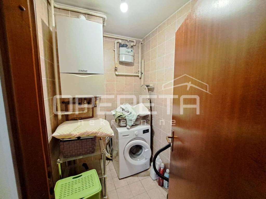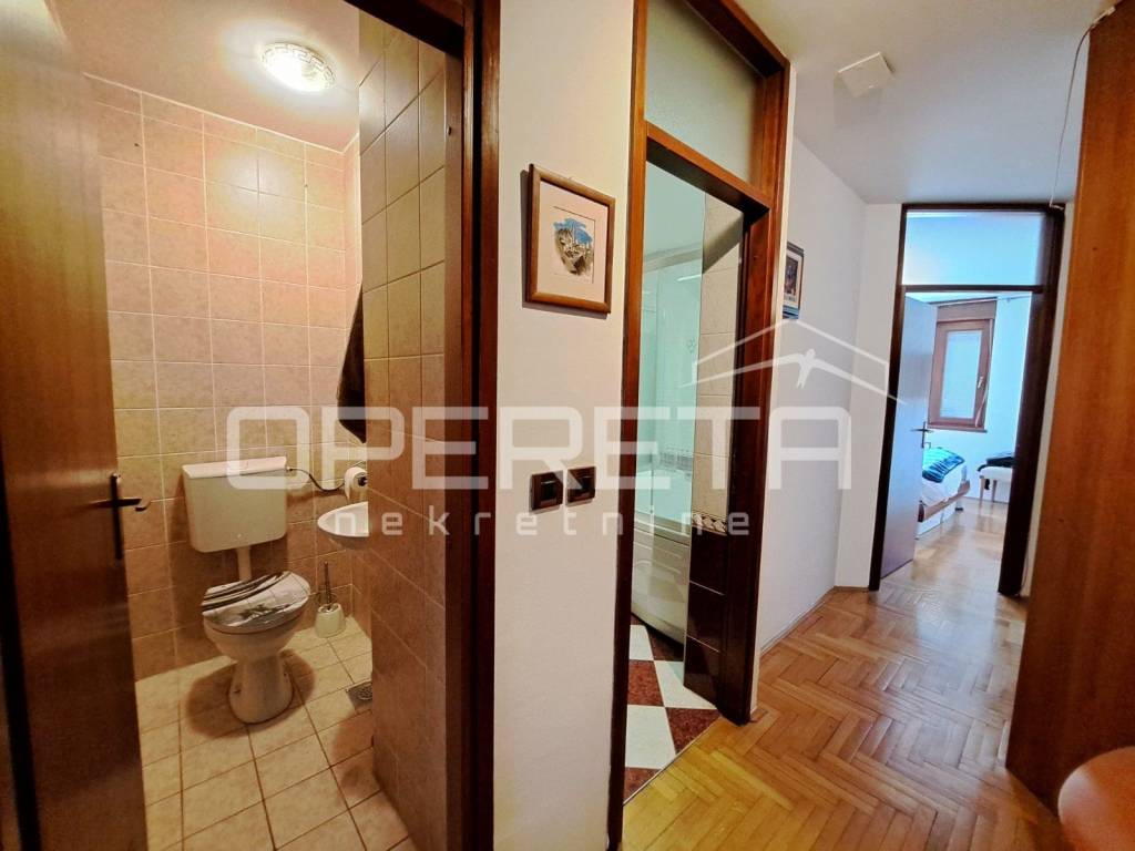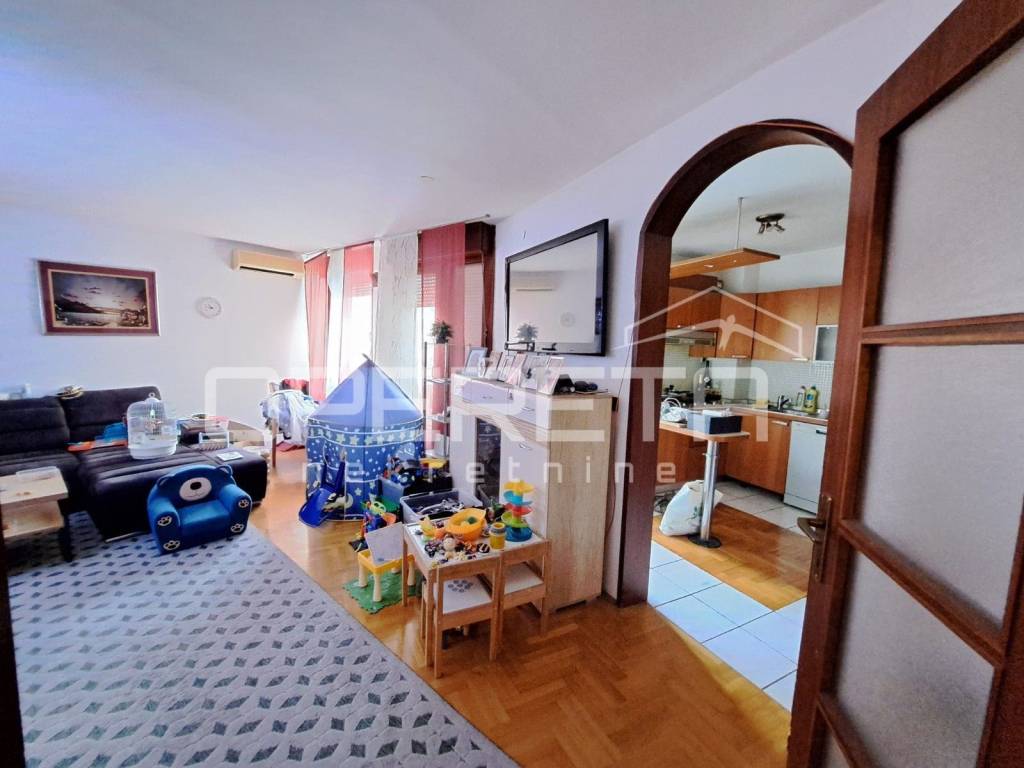 Prodaje se izvrsno očuvan, otvoreni, prozračan i funkcionalan stan. Izvanredna lokacija obzirom na blizinu osnovne i srednje škole, dućana, vrtića, prometnice, autobusne stanice, vlaka, parka i svih potrebnih sadržaja, a sastoji se od ulaznog hodnika kroz koji se ulazi u dnevni boravak, kuhinju, balkon, kupaonicu s WC-om, dodatni WC, dodatna prostorija za rublje (vešeraj), i veću i manju spavaću sobu. Spavaće sobe su orijentirane na zeleni park, dok je dnevna soba okrenuta na zapdnu stranu. Raspored prostorija i veličina stana kreira odličnu priliku da se kuhinja sa svim instalacijama prebaci na zid dnevnog boravka kako bi se dobila dodatna, 3. spavaća soba sa izlazom na balkon. Vlasništvo i papiri uredni, uporabna dozvola upisana, stan nema tereta niti zabilježbi, moguća kupnja putem kredita poslovne banke.