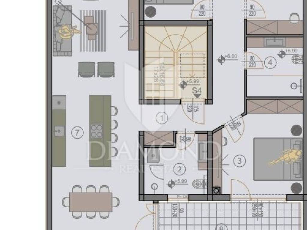 The apartment is located on the second floor of a residential building. The apartment with a total area of 112.55 m2 consists of a hallway, a living room with access to the terrace, a kitchen and a dining room with access to the terrace, two bathrooms, three spacious bedrooms and a wardrobe. The apartment also has a storage room of 2.09 m2, two parking spaces and a garage. The apartment will be finished by the end of 8 months/ 2024.