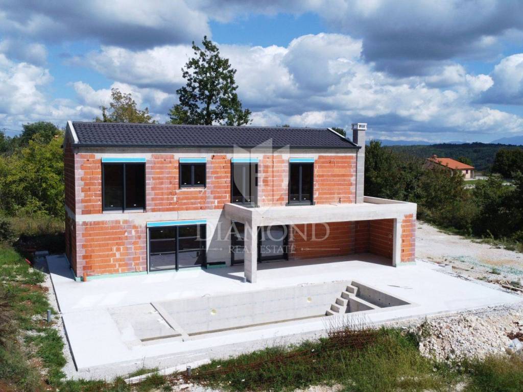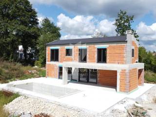 The villa is located on a plot of 950 m², with a total gross area of 185 m² and a net usable area of 153 m² without terraces. The entrance leads to a functional ground floor area where there is a guest toilet, laundry room and technical room, as well as a spacious kitchen with a dining room that connects to the open-plan living room; from the living area there is access to a covered terrace of 27.59 m² where a summer kitchen with a fireplace is planned - an ideal place for outdoor gatherings. Stairs lead to the first floor where there are three comfortable bedrooms, each with its own bathroom, and two have access to a large 33.09 m² terrace that offers a private wellness area, jacuzzi and sunbathing. In terms of equipment, the villa is designed for a high standard of living: underfloor heating ensures comfort, three-layer joinery with mosquito nets and electric shutters increases the energy and usability of the building, and air conditioning in all rooms additionally guarantees comfort throughout the year. In the garden there is a 36 m² swimming pool with massage jets and concrete steps and a spacious sunbathing area; the garden will be horticulturally decorated with automatic irrigation, and the paved parking lot with an electric gate can accommodate four vehicles, ensuring complete privacy and practicality.