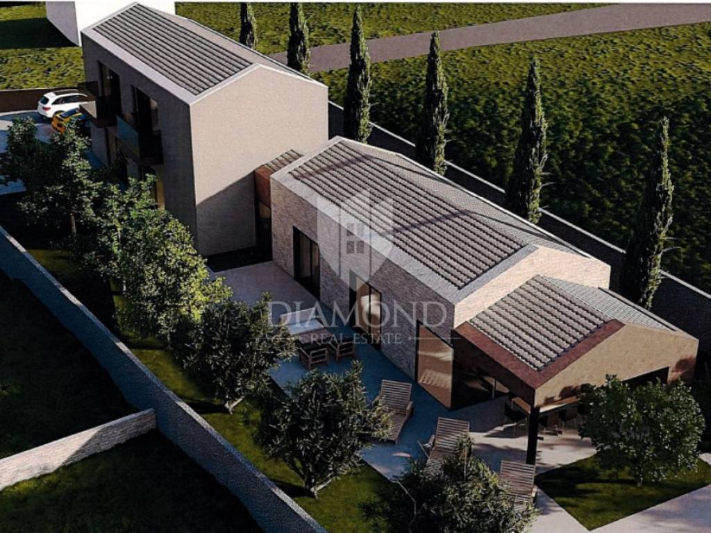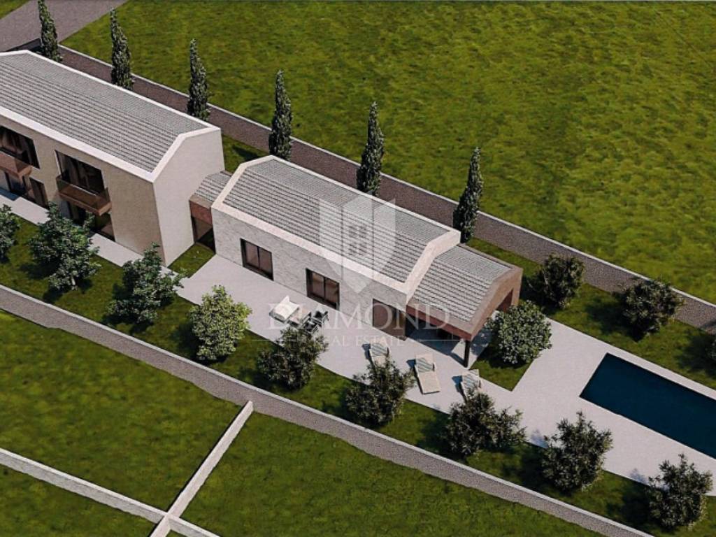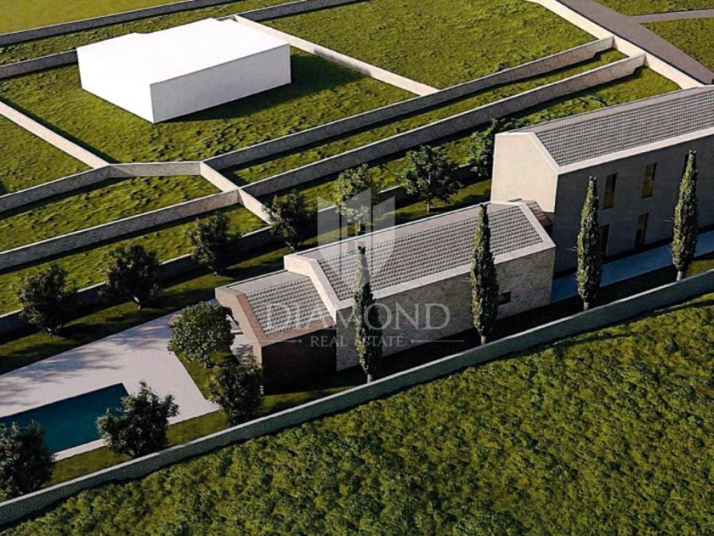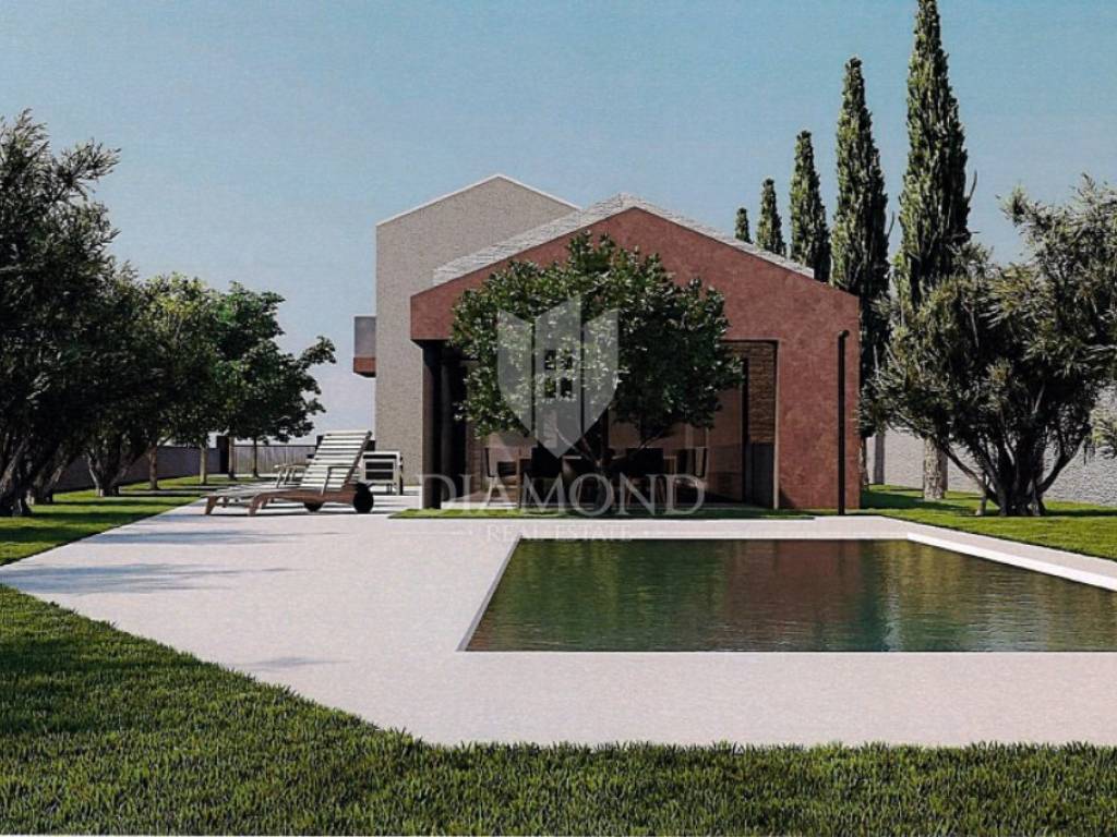 In a quiet part of Sv. Lovreč, a building plot of 1,313 m² is for sale, with a valid building permit and project for the construction of a modern semi-detached house with a swimming pool.