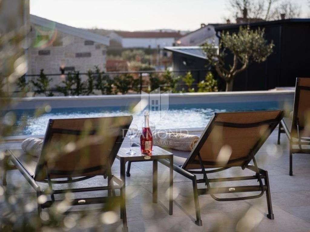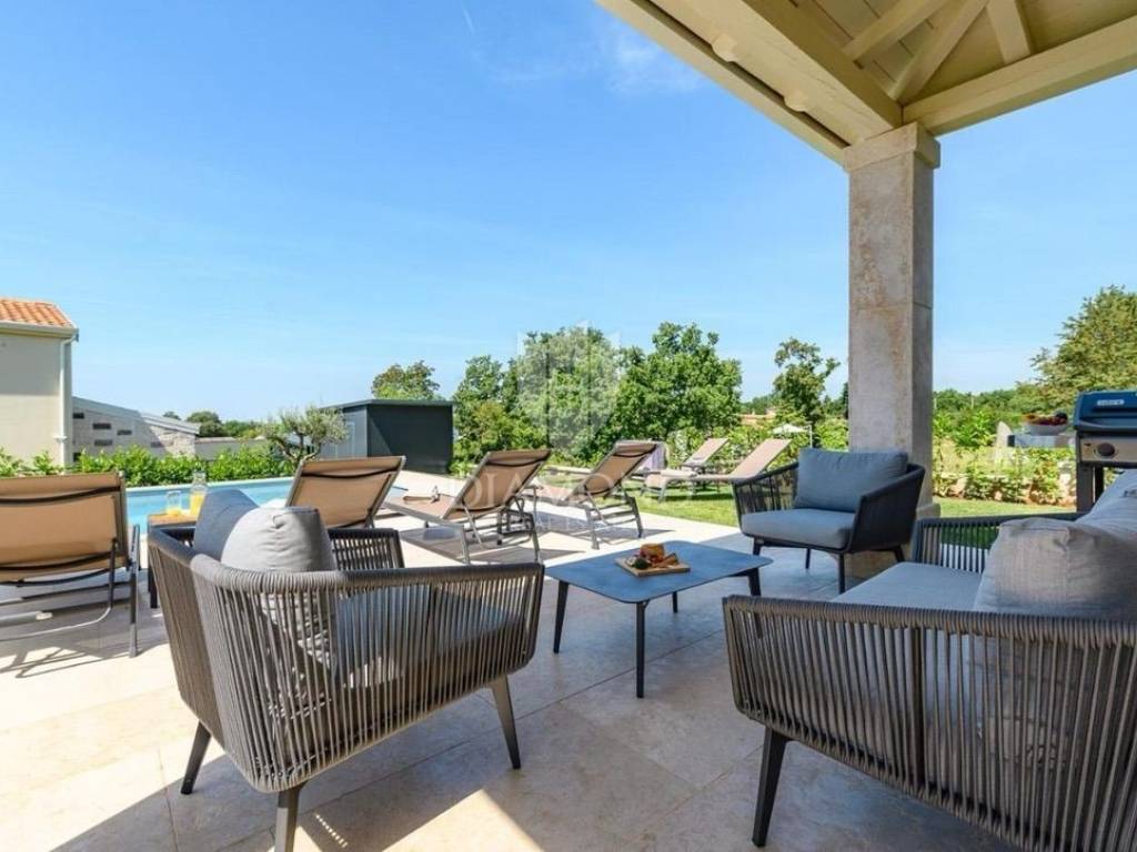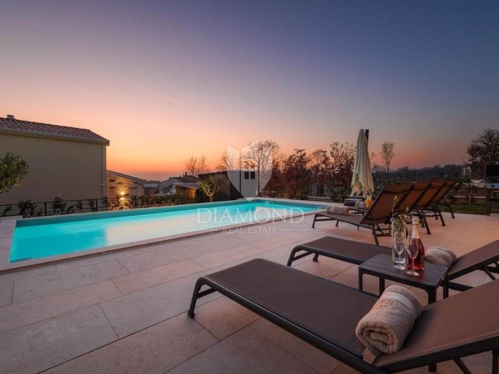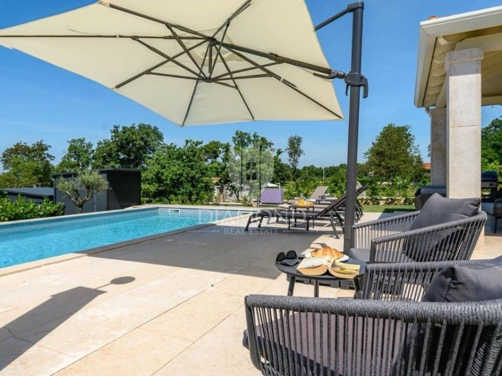 This beautiful property offers the ultimate experience of the Mediterranean lifestyle, providing at the same time peaceful privacy and proximity to all important amenities. Inside the villa, the spacious living area with high ceilings and plenty of natural light creates an impression of airiness and openness. The large windows offer a beautiful view of the surrounding landscapes, while the fireplace adds a dose of warmth and comfort. The contemporary kitchen is equipped with the latest appliances and luxurious details, creating the perfect place to cook and enjoy gastronomic magic. The villa's bedrooms provide an oasis of privacy and relaxation, each with its own bathroom, creating an intimate space for each member of the family or guests. Luxurious equipment and carefully selected materials add a touch of elegance to every room. The highlight of this luxurious home is the heated swimming pool located in a beautiful garden. Surrounded by lush vegetation and flowering shrubs, the pool is the perfect place to relax and enjoy the sun's rays. Spacious terraces and outdoor spaces offer an ideal environment for spending time with family and friends or enjoying silence and privacy. The villa is ideally positioned to allow quick access to all important facilities, as well as the nearby attractions of central Istria. With the perfect blend of luxury, comfort and an outstanding location, this villa with a heated pool offers an unforgettable experience of the Mediterranean lifestyle.