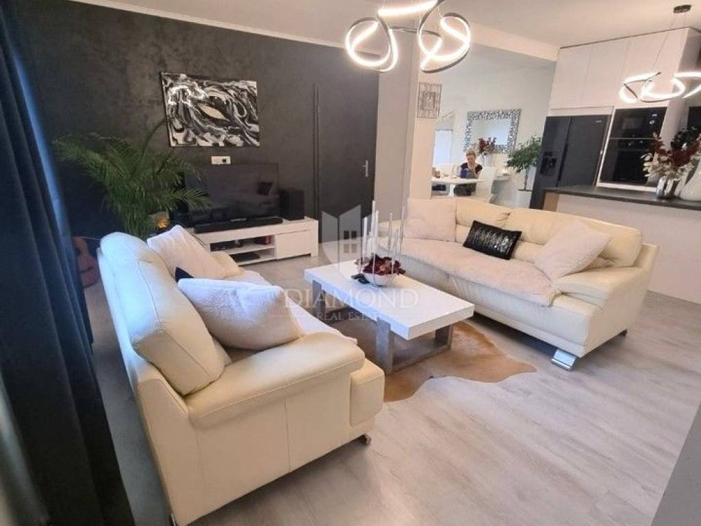 Located in a quiet street yet in an ideal location close to the center of Viškovo, schools, kindergartens, shops, public transport, and all essential amenities, this spacious apartment covers 88.05 square meters. It is situated on the first and top floor of a small residential building with a total of three apartments, ensuring privacy and tranquility.
