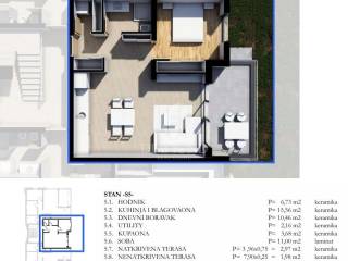 The apartment is on the first floor and consists of: hallway, kitchen with dining area, living room, storage room, bathroom, bedroom, and covered and uncovered terraces.