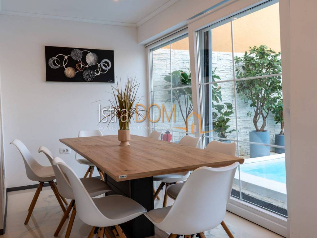 A modernly furnished house is for sale just 3 km from the center of Poreč. The house has a surface area of 150 m², and the 60 m² garden includes an 18 m² swimming pool, perfect for relaxing during summer days.