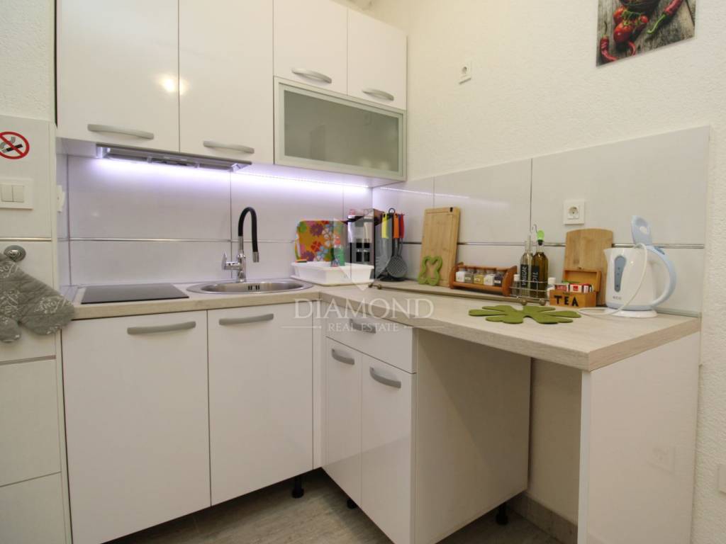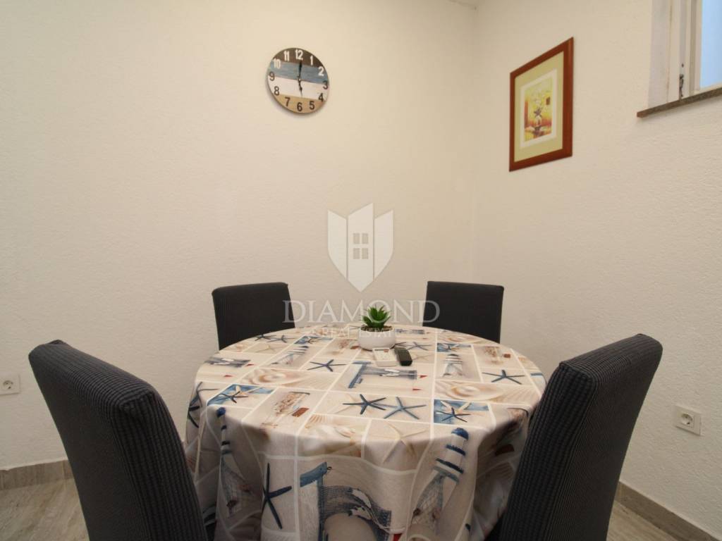 A 37 m² apartment for sale, located in the beautiful town of Malinska on the island of Krk. It consists of a kitchen with dining area, living room, bedroom, and bathroom.