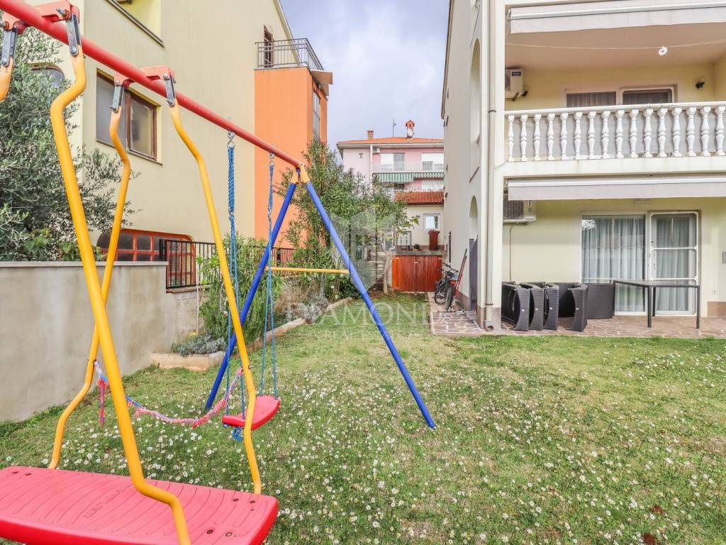 The first floor includes another comfortable apartment with three bedrooms, a hallway, bathroom, additional toilet, storage room, and a kitchen with a dining area and living room that opens onto a large balcony overlooking the greenery. Both apartments are equipped with electric central heating.