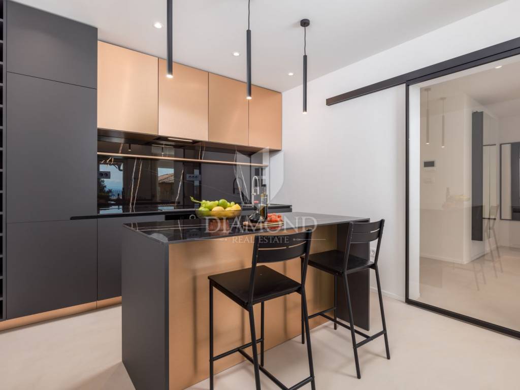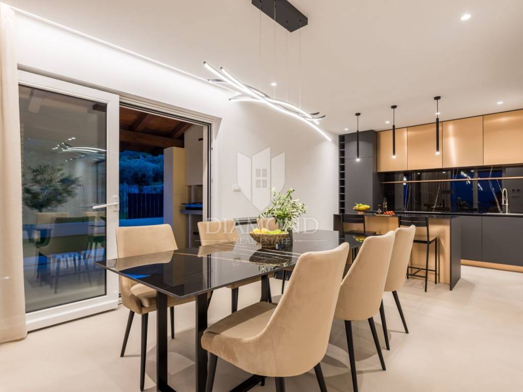 The interior of the villa exudes elegance and functionality. The bright and spacious living room, filled with natural light, has direct access to a terrace offering an unforgettable sea view. The kitchen and dining area are modernly equipped with high-quality appliances, perfect for cooking enthusiasts and those who enjoy shared meals. The villa features four luxurious bedrooms, each with its own bathroom, ensuring maximum privacy and comfort.