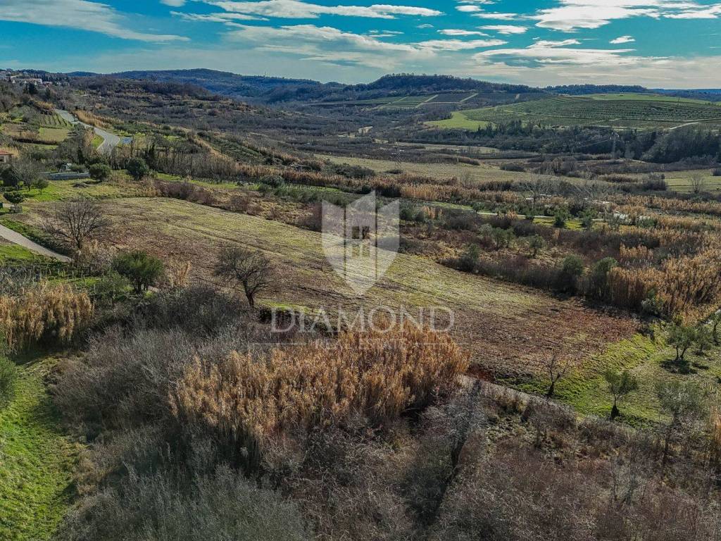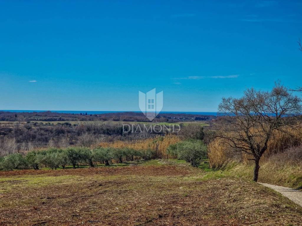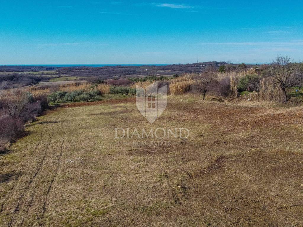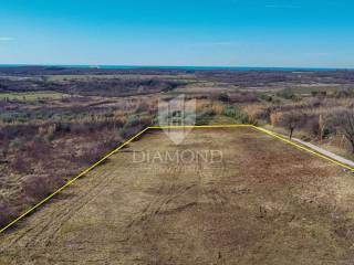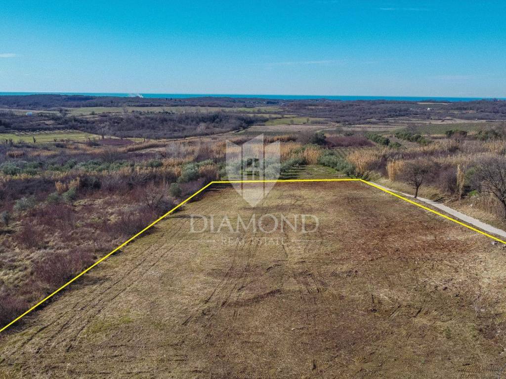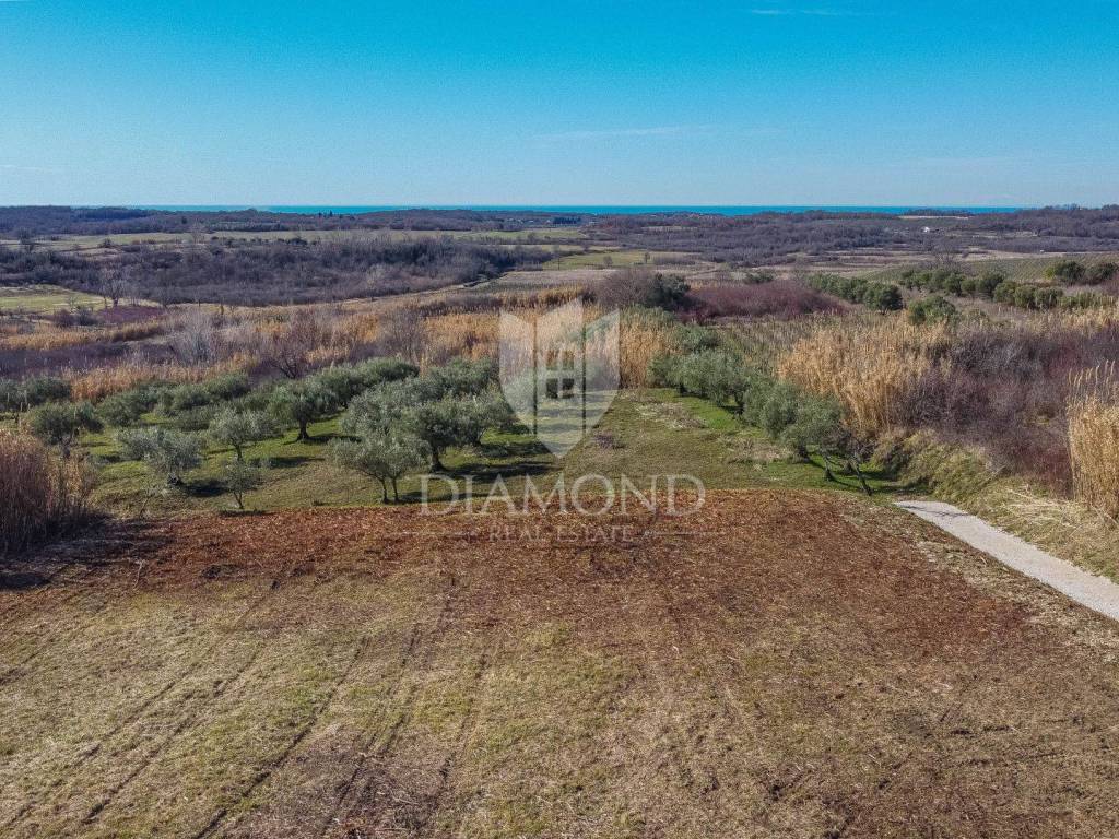Buje, land with an open view of the sea on the edge of the construction zone. A plot of land of 4,125 m2 with an open view of the sea and greenery is for sale, only 8 km from the border with Slovenia and only 9.5 km from the sea. The land is of a regular shape, for residential purposes with an access road and the necessary infrastructure (electricity and water) are located right next to the land, it is located on the edge of the construction zone, surrounded by olive trees. Suitable for building detached villas with a swimming pool and a spacious yard.