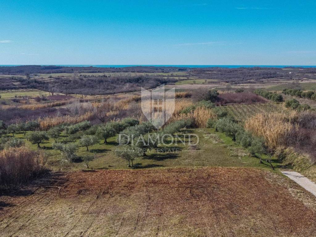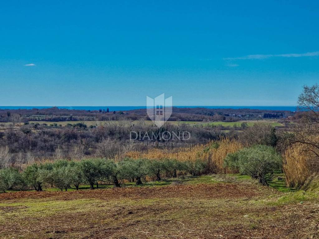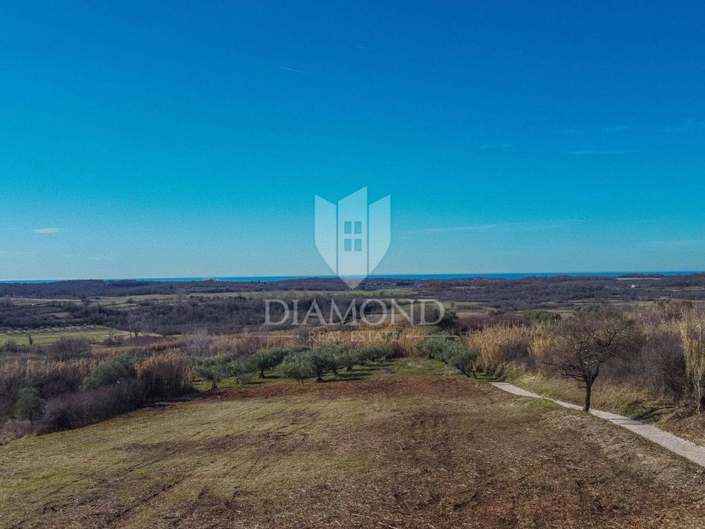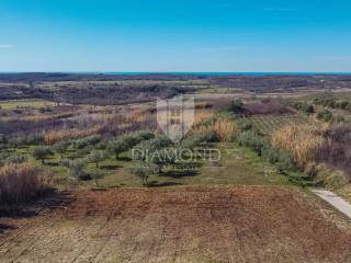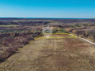 Buje, land with an open view of the sea on the edge of the construction zone. A plot of land of 1.031 m2 with an open view of the sea and greenery is for sale, only 8 km from the border with Slovenia and only 9.5 km from the sea. The land is of a regular shape, for residential purposes with an access road and the necessary infrastructure (electricity and water) are located right next to the land, it is located on the edge of the construction zone, surrounded by olive trees. Suitable for building detached villas with a swimming pool and a spacious yard.