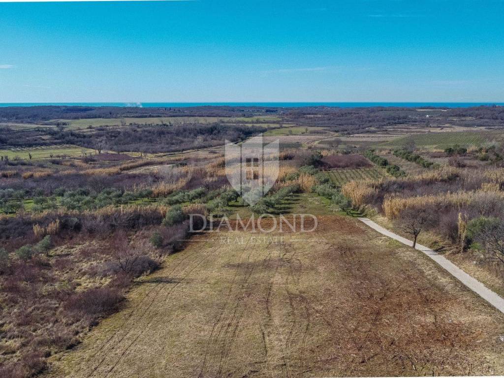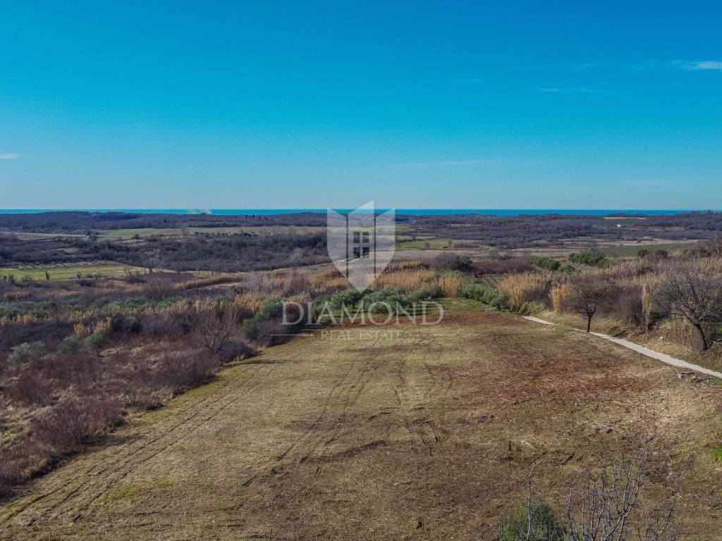 Buje, land with an open view of the sea on the edge of the construction zone. A plot of land of 1.031 m2 with an open view of the sea and greenery is for sale, only 8 km from the border with Slovenia and only 9.5 km from the sea. The land is of a regular shape, for residential purposes with an access road and the necessary infrastructure (electricity and water) are located right next to the land, it is located on the edge of the construction zone, surrounded by olive trees. Suitable for building detached villas with a swimming pool and a spacious yard.