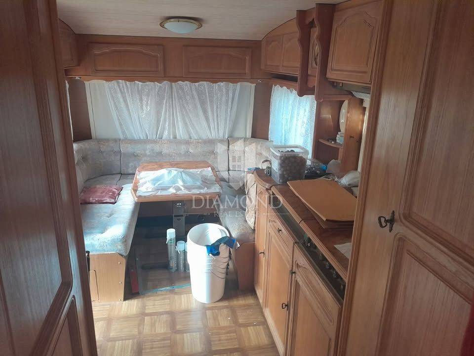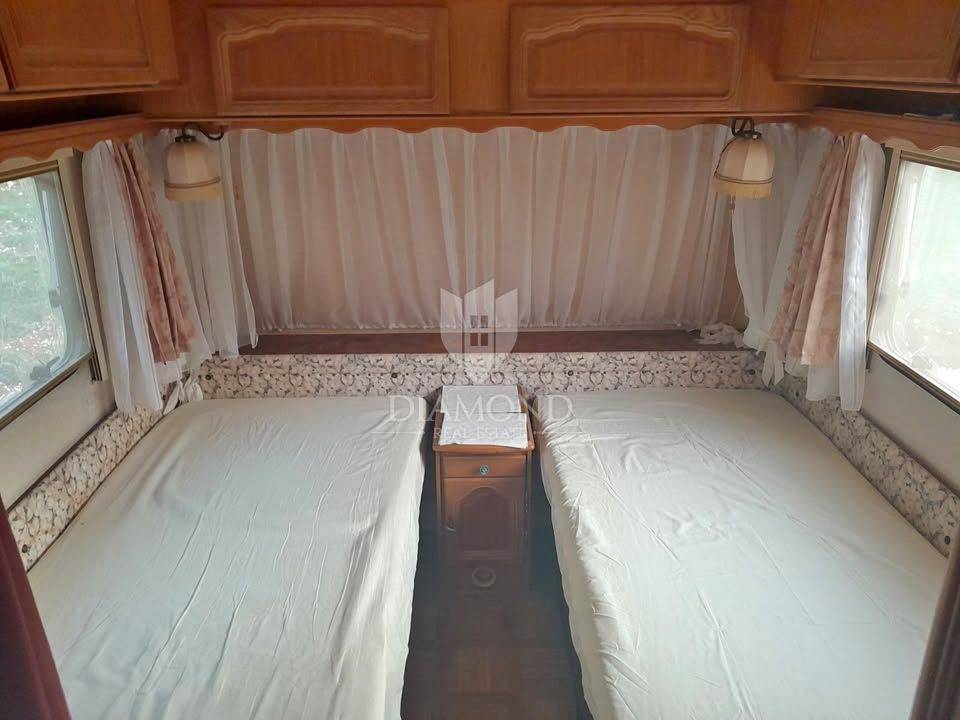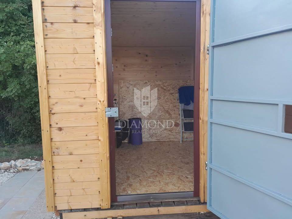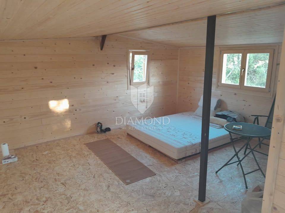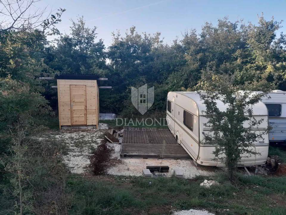 The size is 2,158 m2, and there is a wooden house on it measuring 25 m2, which serves as a storage for various larger items. The house is built on wooden posts. It has two water tanks (2,000 liters). It also has two caravans. The larger one, 7 meters, is in excellent condition, and the smaller one serves as a storage for smaller items. A septic tank has been built on which an outdoor ecological toilet has been installed. An orchard has been planted - 20 trees of local, indigenous varieties (pears, apples, plums, sour cherries, apricots, peaches). A canopy with two water tanks (2,000 liters) has been built. Fruit trees or other crops can also be planted on the property. Rainwater is collected as water, which is abundant in this area. Electricity is right nearby, 50 m away. It is an exceptionally beautiful, peaceful and protected location for relaxing work and a pleasant stay. There is a small village (mainly elderly population) 200 meters away, and a few kilometers away is the town of Svetvinčenat, filled with interesting social, cultural and tourist activities all year round.