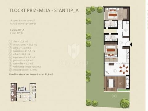 Novigrad, new building - ground floor This beautiful apartment in its 93 m2 offers a spacious living room consisting of a kitchen, dining room and a comfortable living room, creating the perfect place for socializing and relaxing. In addition, the apartment has three spacious bedrooms, each with its own bathroom for additional privacy and comfort. The living room opens onto a beautiful large covered terrace with a summer kitchen, ideal for enjoying the fresh air and relaxing outdoors. The apartment also boasts a beautiful garden of 132 m2, a true paradise for those who love spending time outdoors. The apartment also includes a parking space and additional storage, ensuring comfort and safety for all residents. Underfloor heating, air conditioning in each room for temperature regulation and the highest quality materials make this project special in every way. This is truly a home that offers everything you need for a comfortable and elegant lifestyle.