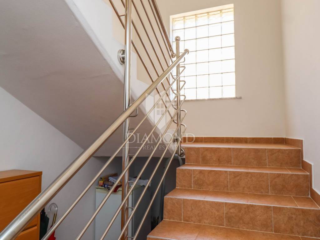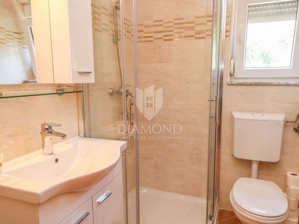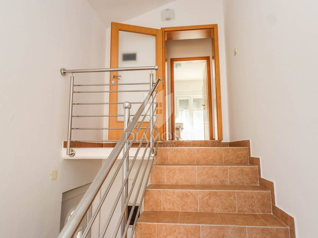 The surface of the house is 117 m2 and it is spread over the ground floor and first floor. On the ground floor there is one bedroom, bathroom with shower, kitchen and living room with access to a covered terrace. The terrace faces the fenced yard and is ideal for drinking coffee in the morning in contact with pure nature. An internal staircase leads to the first floor, where there are 3 additional bedrooms and one bathroom with a shower. Two bedrooms have access to a common balcony with a view of the yard. Due to its layout, the house can be used as two separate apartments with a common entrance. The yard is completely fenced and extends over 350m2. In the yard there is a place for a barbecue, an outdoor shower, a garden house and a parking space for several cars. The yard is planted with fruit and Mediterranean herbs, which gives the whole property freshness and at the same time the feeling of warmth of home.