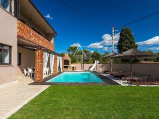 On the first floor, a smaller Wellness area with a sauna and Pilates training is reached through an internal staircase. There are three additional bedrooms and two bathrooms. A more enormous covered terrace with a jacuzzi and a countryside view adorns the top level. A central pellet heating system and air conditioning on each level are installed in the home.