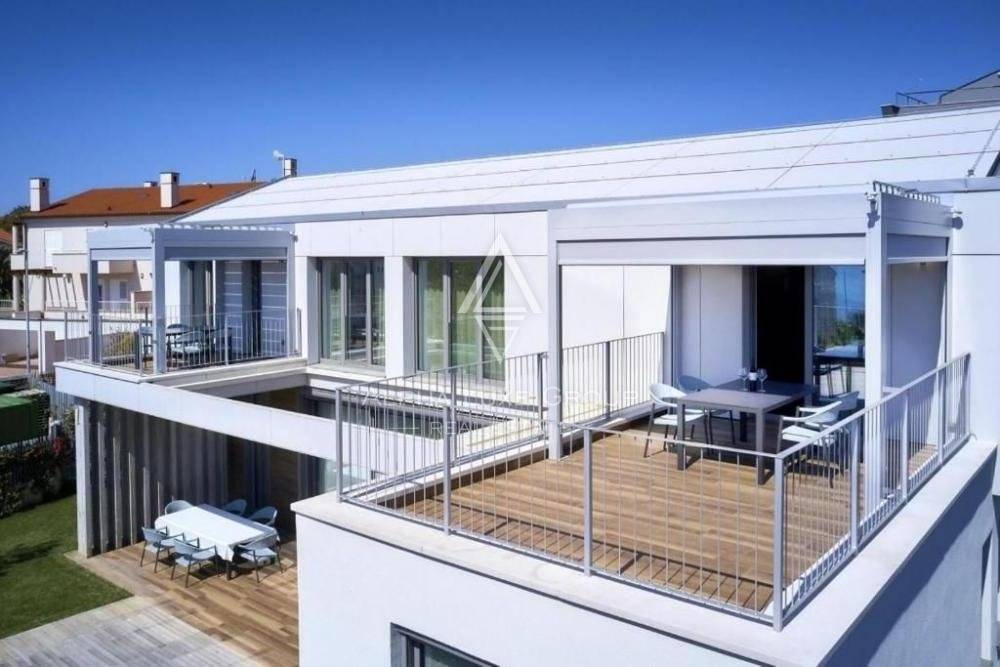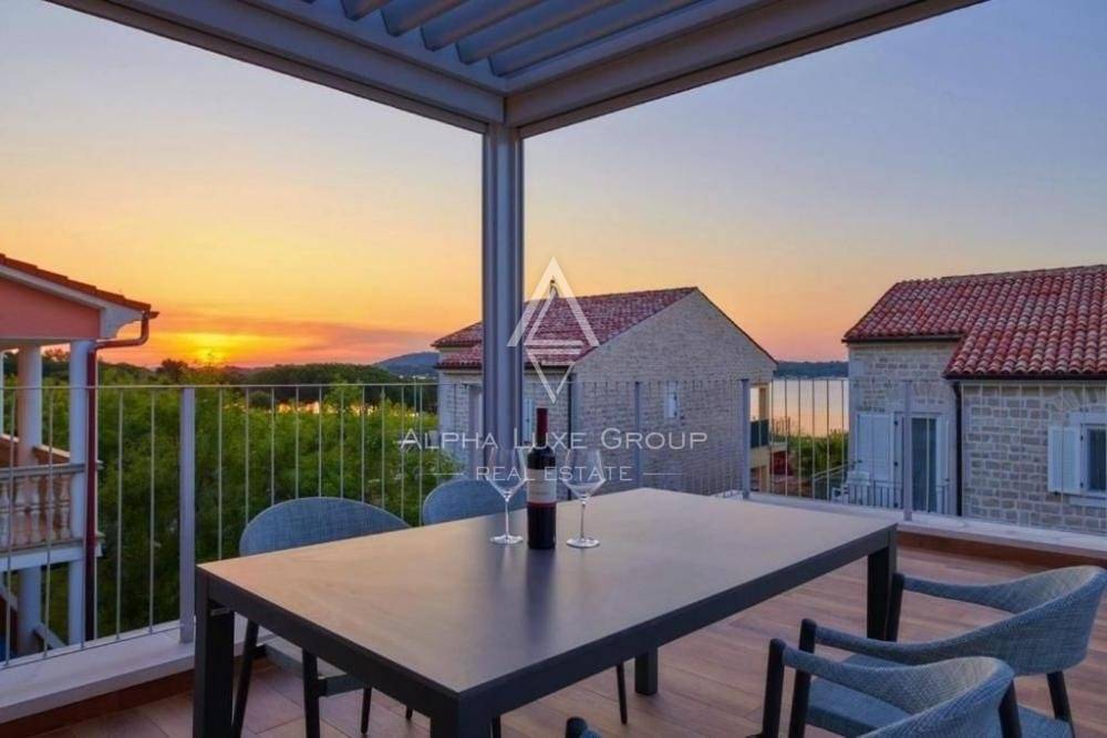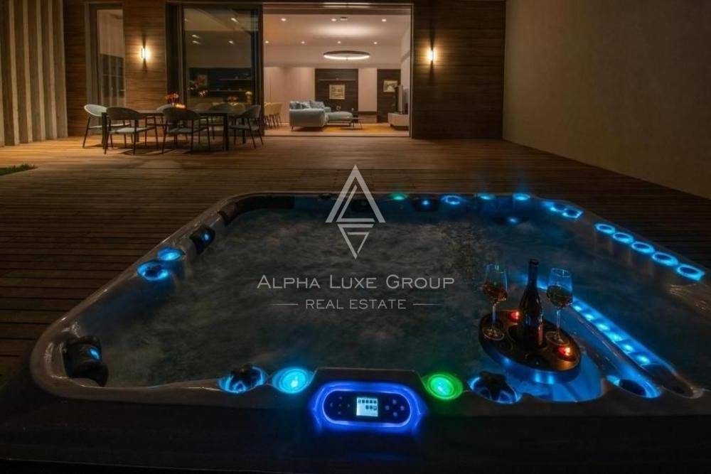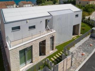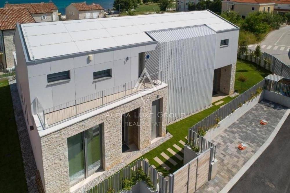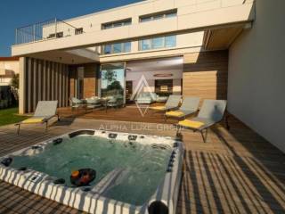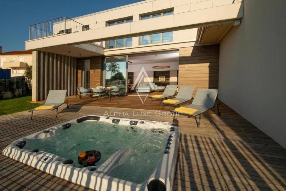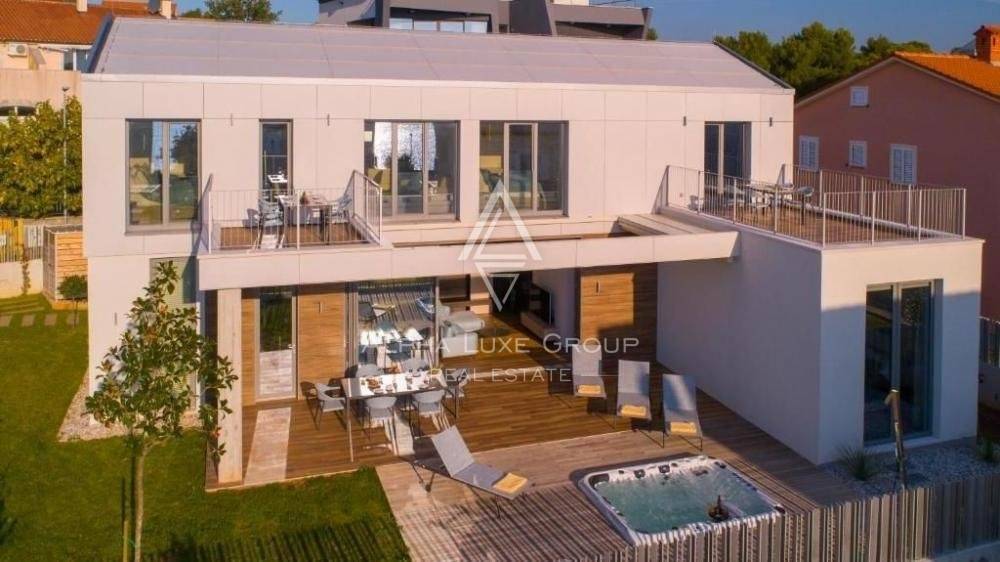 A luxury house for sale in Medulin, only 100 meters from the beach. On the ground floor of the house there is a large apartment with an entrance hall, a bathroom and two bedrooms, each equipped with its own bathroom, a pantry and a spacious kitchen with a dining room and a living room with access to a terrace with a beautiful view and a jacuzzi for relaxation. There is also a boiler room with space for bicycles and a storage room.