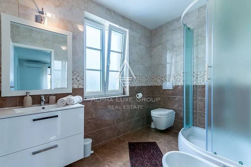 Just a short distance from Barban's bustling center lies a meticulously crafted house. This stunning abode is ideally situated to offer peaceful rural living with all the conveniences of the nearby urban centers. The property extends over two elegantly appointed levels and is designed to provide a singular, expansive living experience.