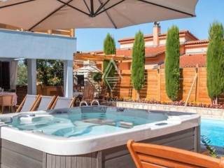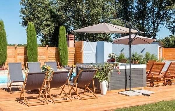 Throughout the villa, the harmonious interplay of wood and stone enhances the natural ambiance. Privacy is paramount within the 743m² fully enclosed grounds, offering a secluded oasis with a swimming pool and an outdoor Jacuzzi, set amidst a relaxation area. The remainder of the plot, spanning 532m², is adorned with a vibrant, well-tended garden bursting with colorful flowers, providing a perfect escape from urban bustle.