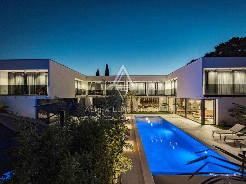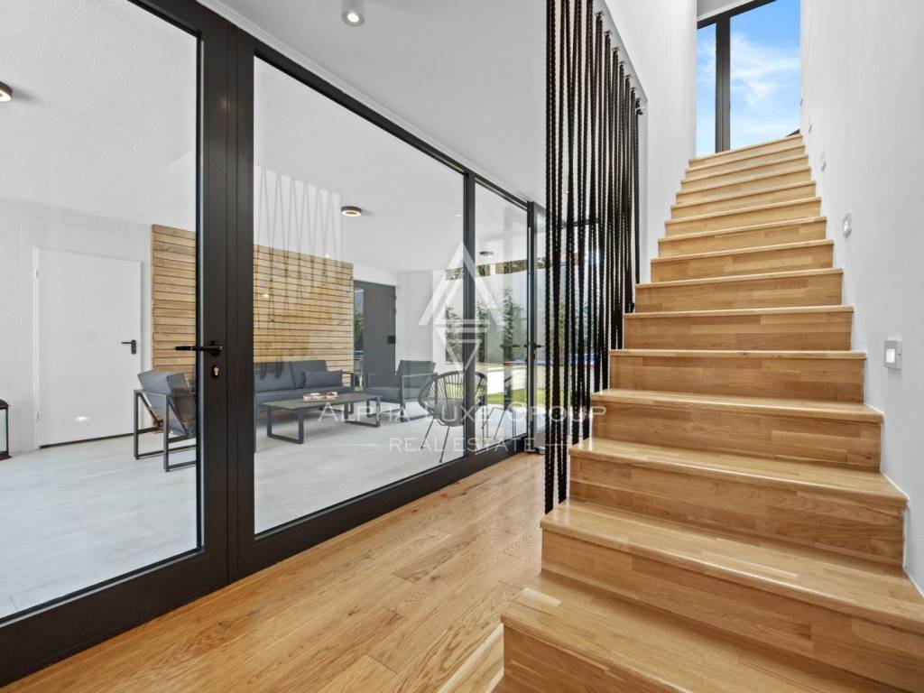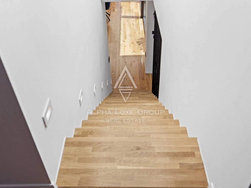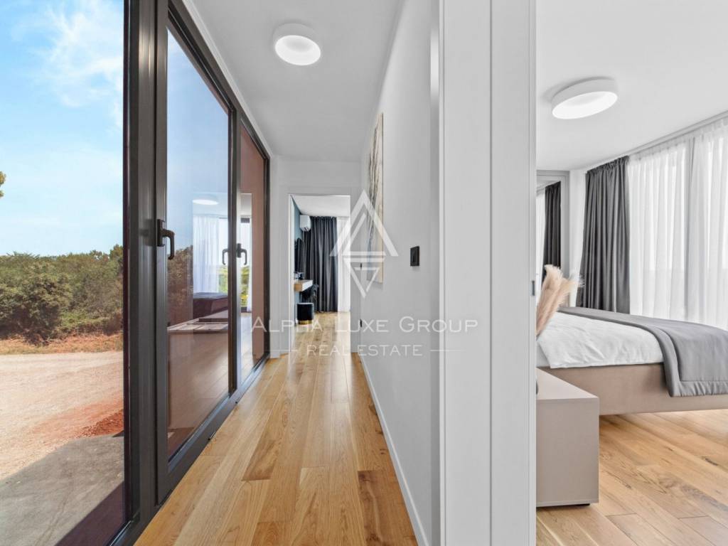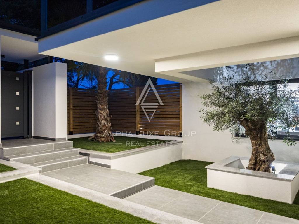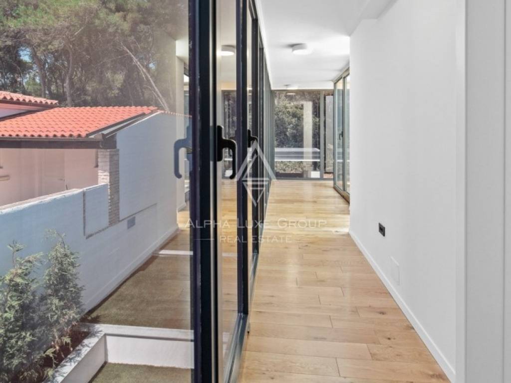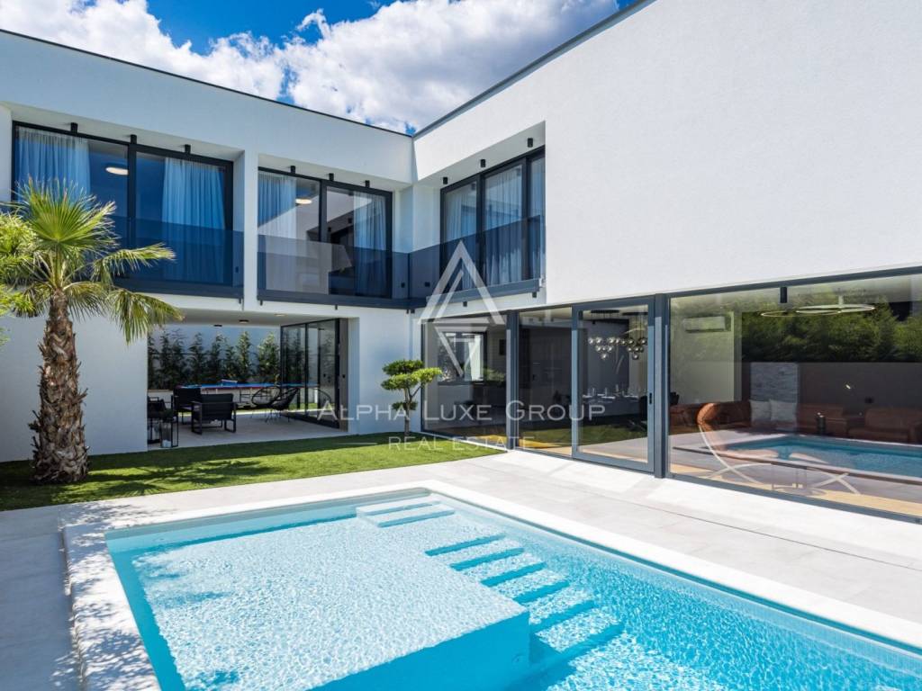 This exquisite modern villa is ideally positioned, just a short distance from the town center. It spans across the ground and first floors, boasting a total living area of 220m2. The ground floor features a spacious living room, a contemporary and custom-designed Dieter Knoll kitchen, and a dining area. The living room is enhanced by an electric fireplace and an expansive aluminum sliding wall that ensures ample natural light throughout the year. Ascending the internal staircase to the first floor, you'll discover four bedrooms, each with its private bathroom. The corridor is elegantly illuminated by a glass wall running along the entire side of the house.