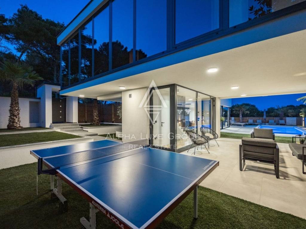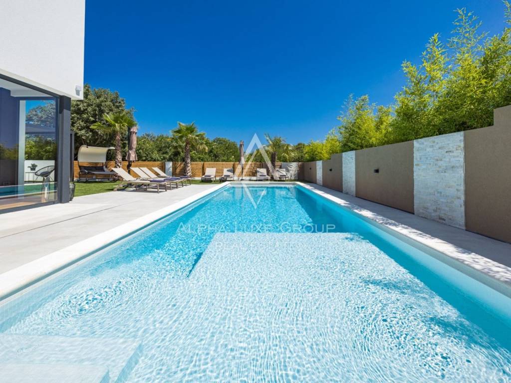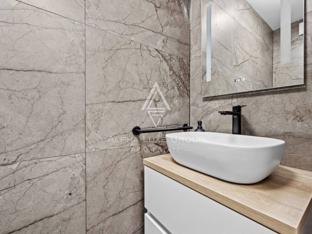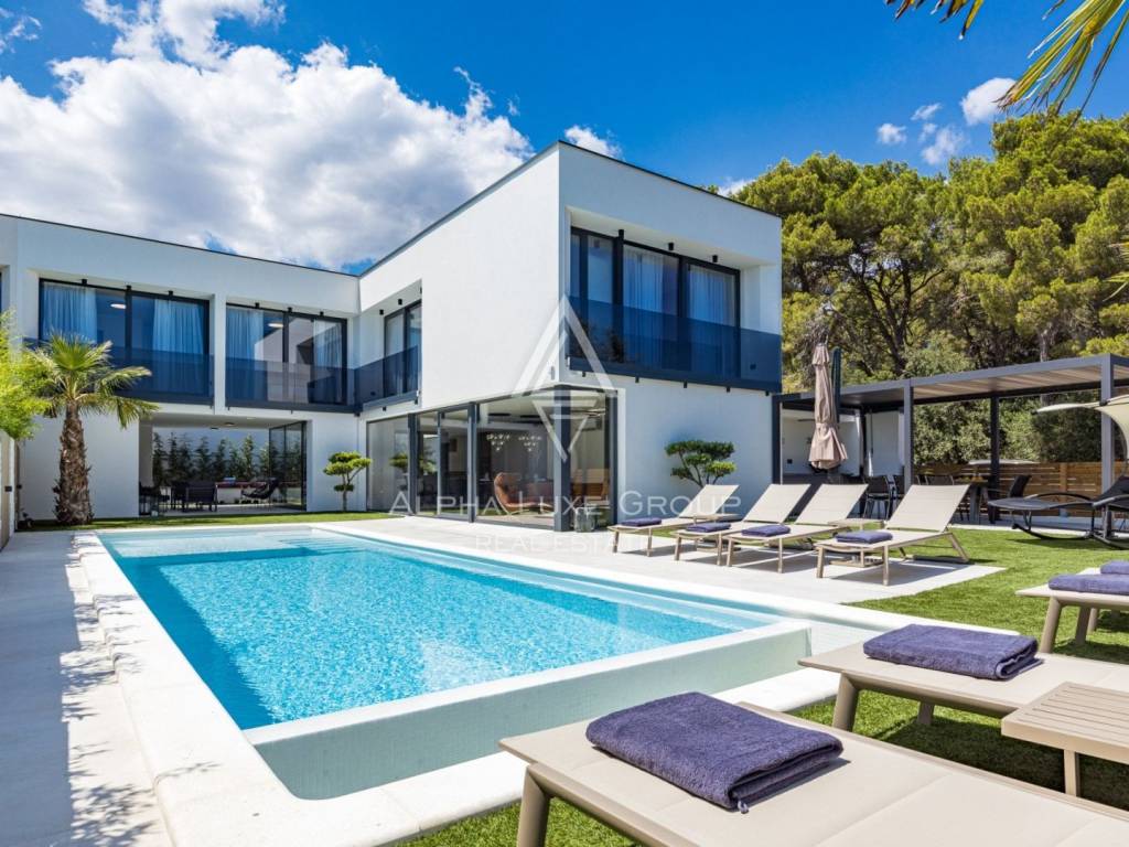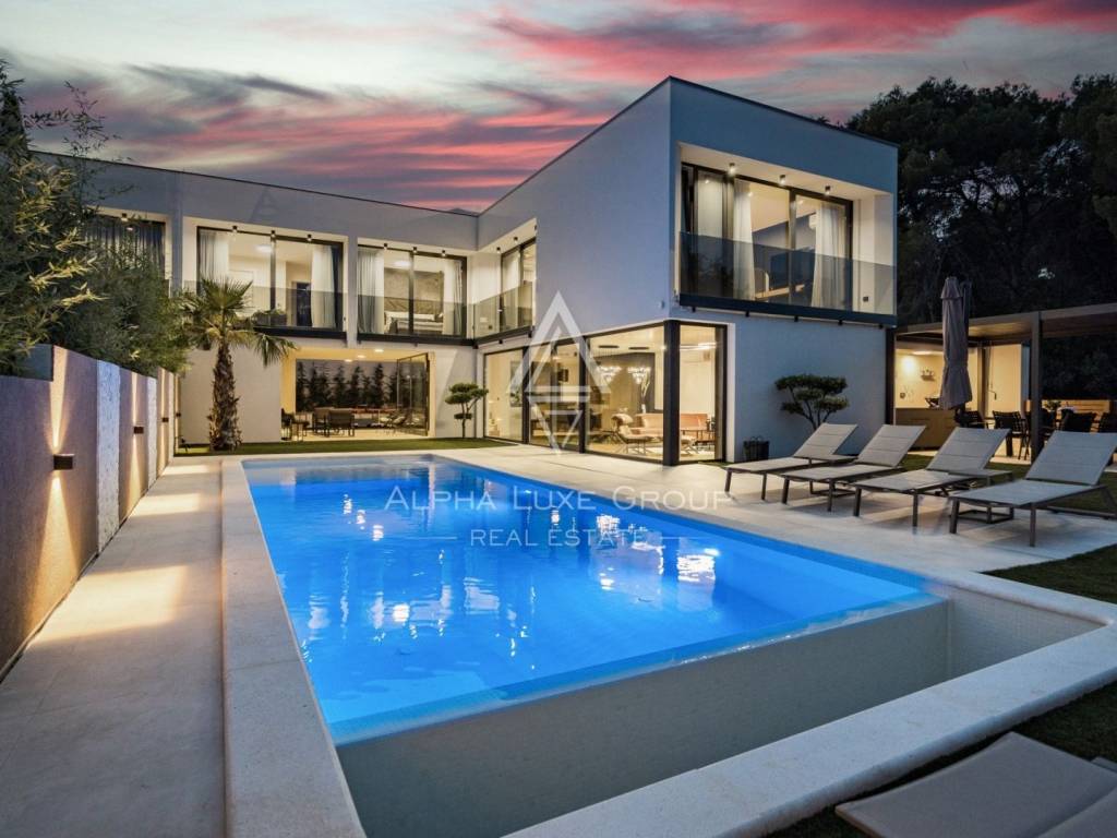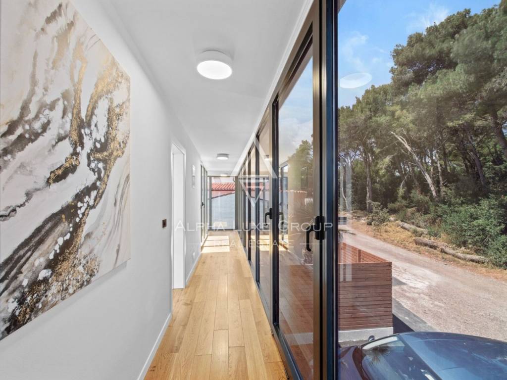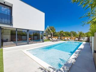 This exquisite modern villa is ideally positioned, just a short distance from the town center. It spans across the ground and first floors, boasting a total living area of 220m2. The ground floor features a spacious living room, a contemporary and custom-designed Dieter Knoll kitchen, and a dining area. The living room is enhanced by an electric fireplace and an expansive aluminum sliding wall that ensures ample natural light throughout the year. Ascending the internal staircase to the first floor, you'll discover four bedrooms, each with its private bathroom. The corridor is elegantly illuminated by a glass wall running along the entire side of the house.