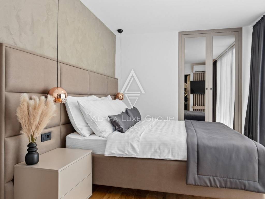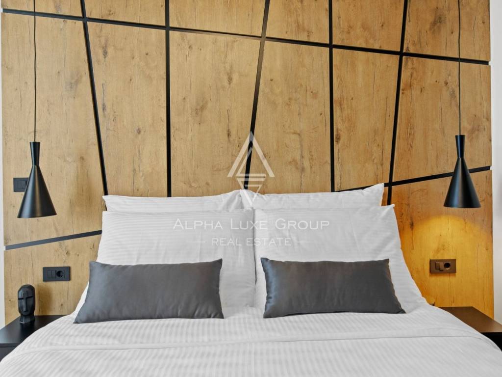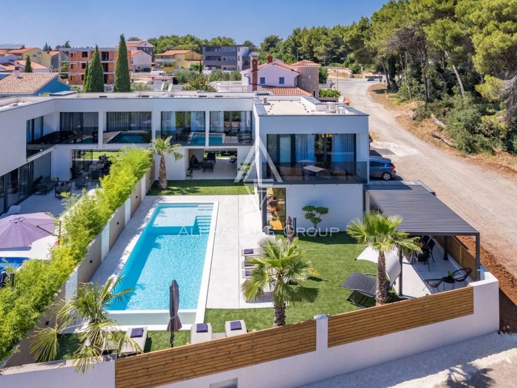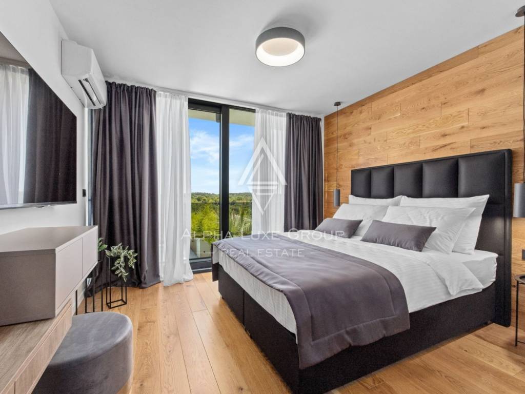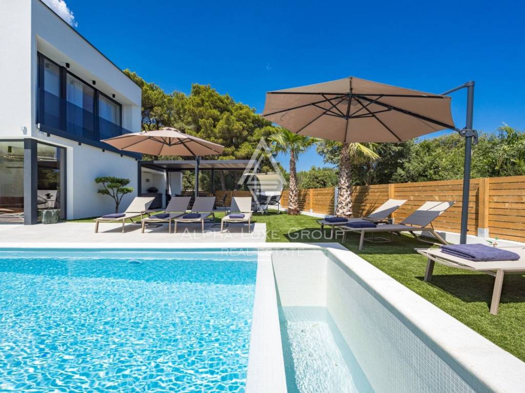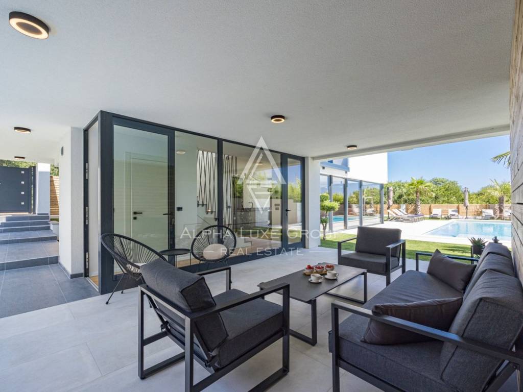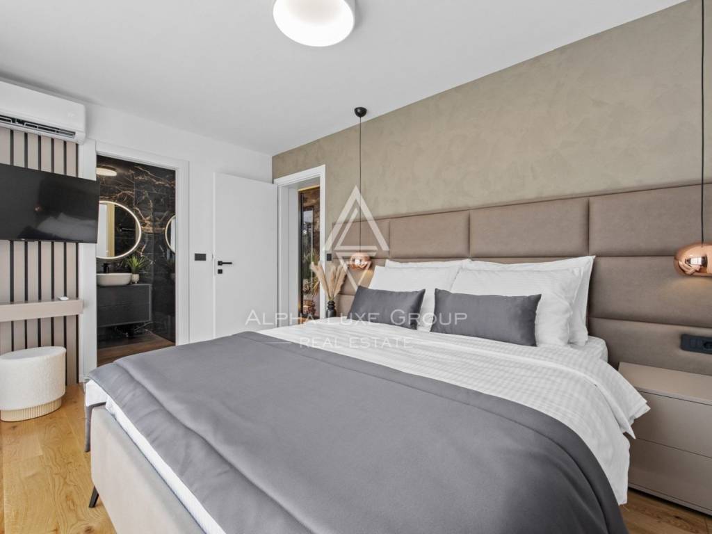 This exquisite modern villa is ideally positioned, just a short distance from the town center. It spans across the ground and first floors, boasting a total living area of 220m2. The ground floor features a spacious living room, a contemporary and custom-designed Dieter Knoll kitchen, and a dining area. The living room is enhanced by an electric fireplace and an expansive aluminum sliding wall that ensures ample natural light throughout the year. Ascending the internal staircase to the first floor, you'll discover four bedrooms, each with its private bathroom. The corridor is elegantly illuminated by a glass wall running along the entire side of the house.