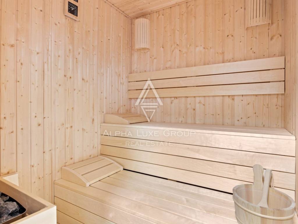 Outside, the 324m2 garden offers a 40m2 heated swimming pool, an outdoor terrace, a sauna, a shower, and a table tennis table. The lush greenery includes olive trees, palm trees, Mediterranean shrubs, and manicured lawns, creating a serene oasis. Parking for up to four cars is conveniently located at the entrance to the property.