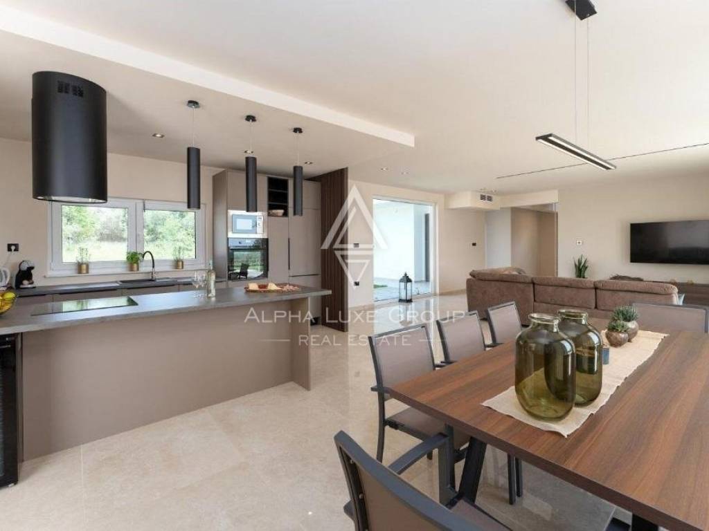 Located in the surroundings of Poreč, Istria, this remarkable modern villa offers a picturesque view of the sea. Originally two separate settlements, Tar-Torre and Vabriga-Abrega, have now merged into one town, divided by the main road connecting Poreč and Novigrad. Situated on a fertile plateau at 112 meters above sea level, the town slopes towards the sea on one side and towards the mouth of the Mirna River on the other. This region is renowned for its exceptional olive oil, with olives cultivated in the Larun plantation at the foot of Tar-Torre, yielding exquisite olive oil.