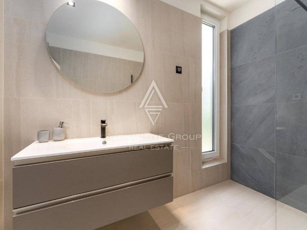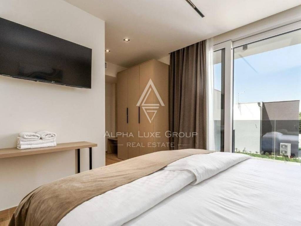 The villa is nestled on an 854 m2 plot and boasts a generous area of 296 m2. Crafted to meet 5-star categorization standards, this villa was meticulously built with top-quality materials. Ambient lighting has been thoughtfully installed throughout, enhancing the villa's charm. The ground floor encompasses a spacious living room, an open-concept kitchen and dining area, a bathroom, a storage room, and an additional space designed for wellness, complete with a sauna and jacuzzi. This wellness area provides direct access to the garden and the inviting pool. Floor-to-ceiling glass walls grace the entire living room, flooding the space with natural light. From the living room, step out onto a covered terrace with a summer kitchen and barbecue, ideal for al fresco dining. An elegant staircase leads to the first floor, where you'll find four bedrooms, each with its private bathroom. Three of these bedrooms offer covered terraces with captivating sea views. The villa also boasts a basement, a versatile space that can be transformed into a playroom, offering extra entertainment options, especially on rainy days.
