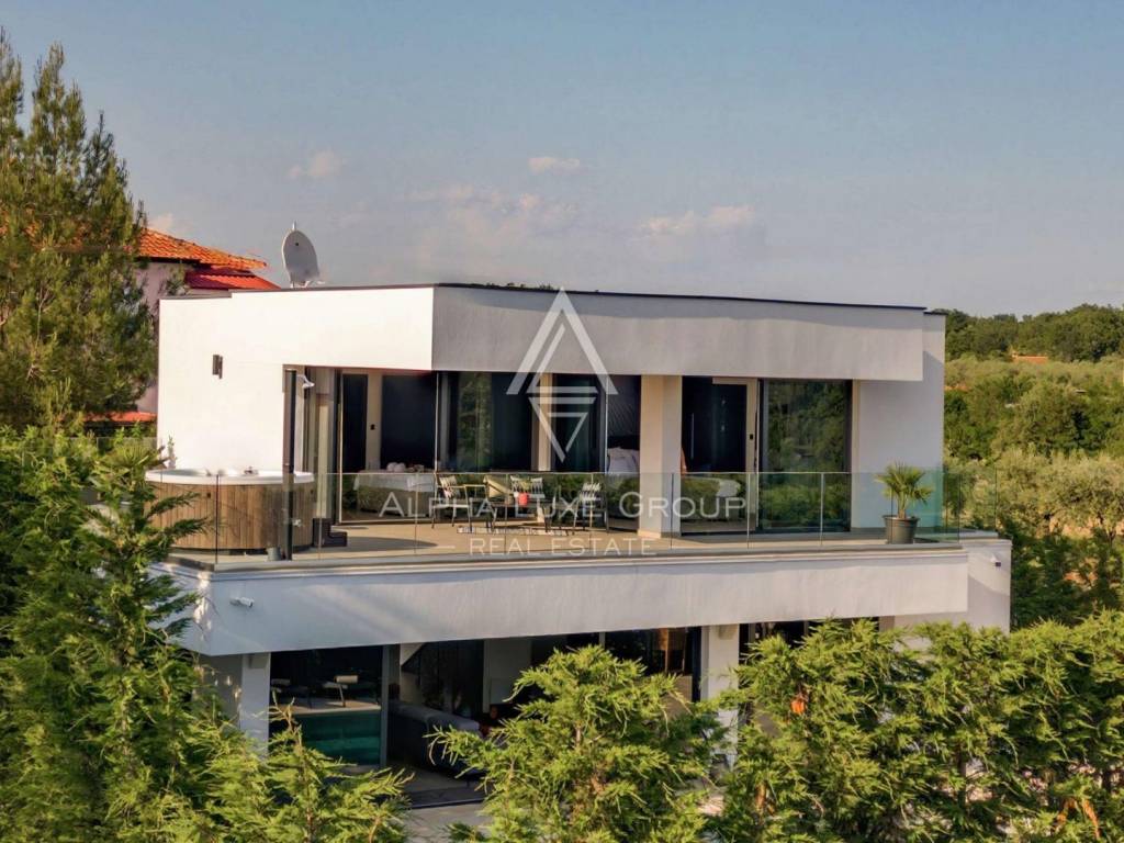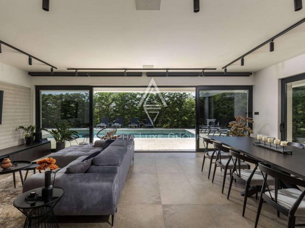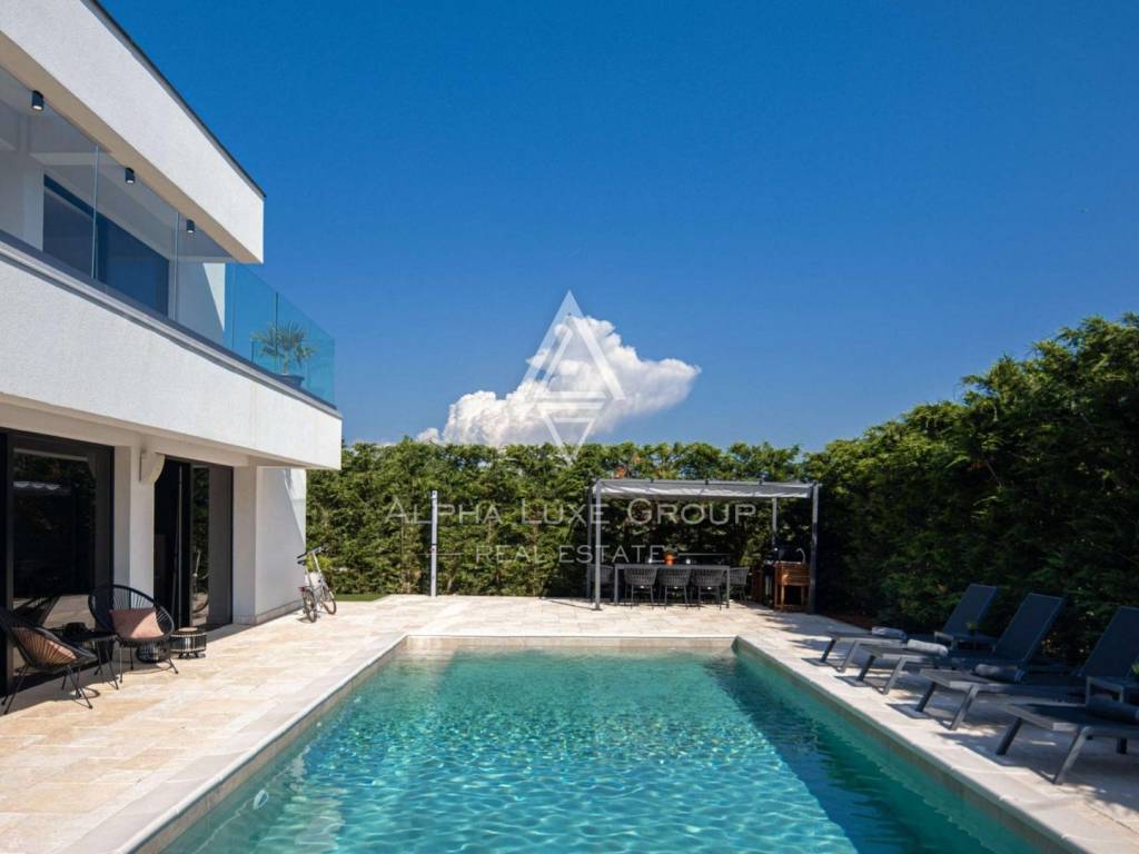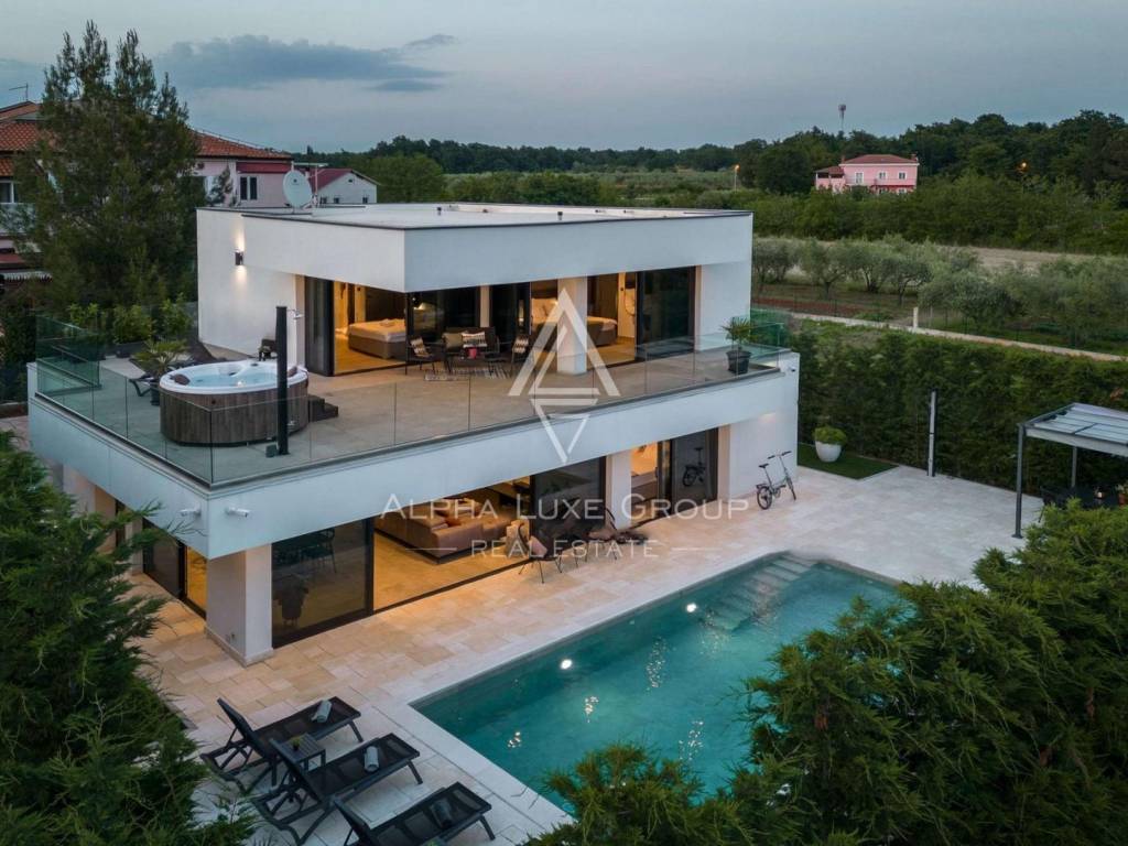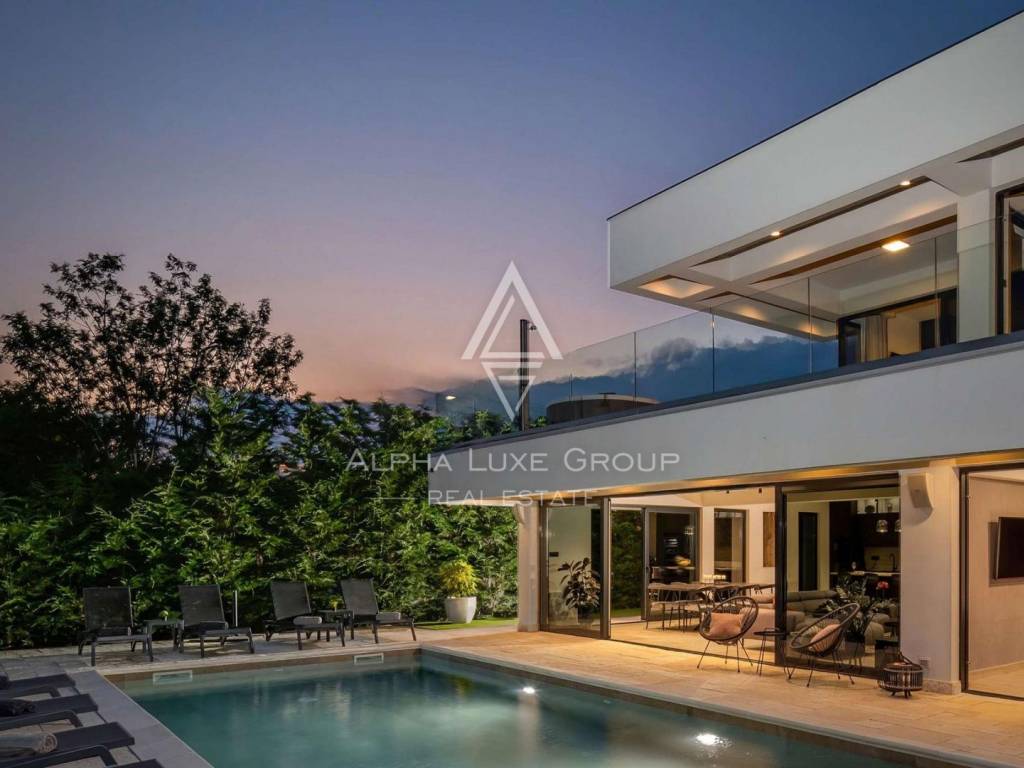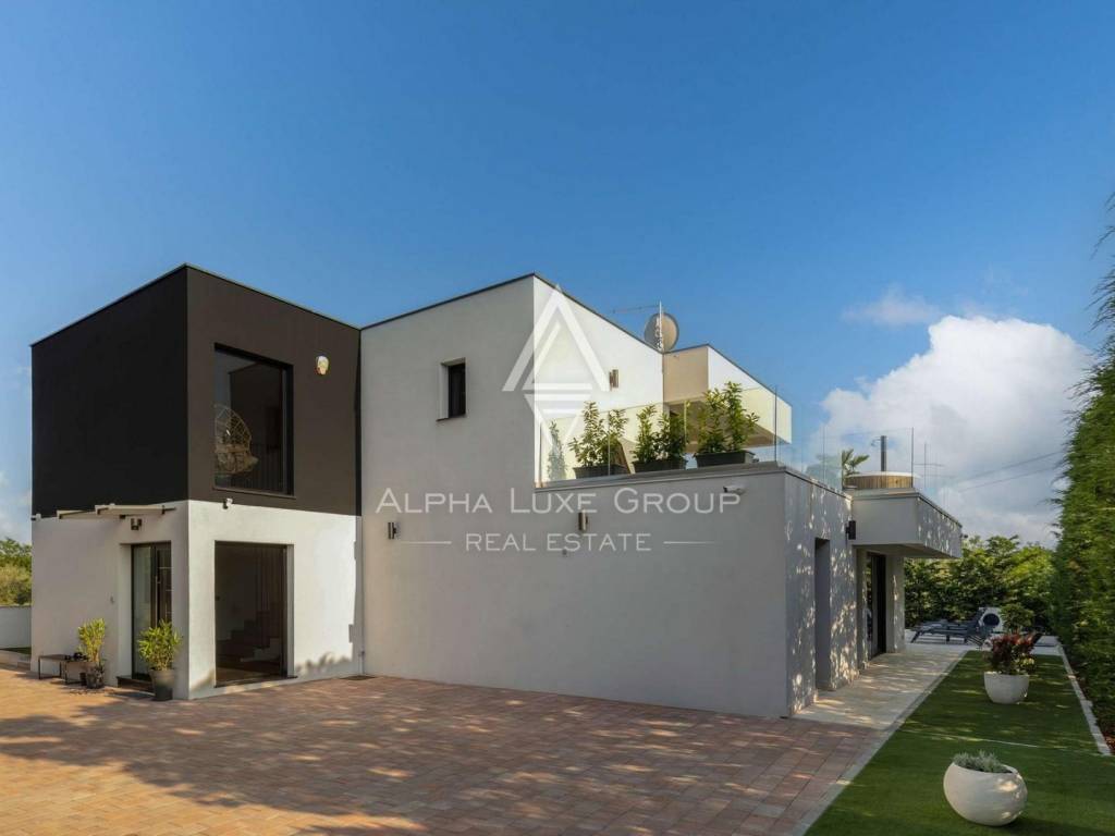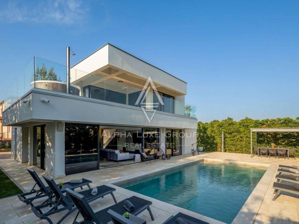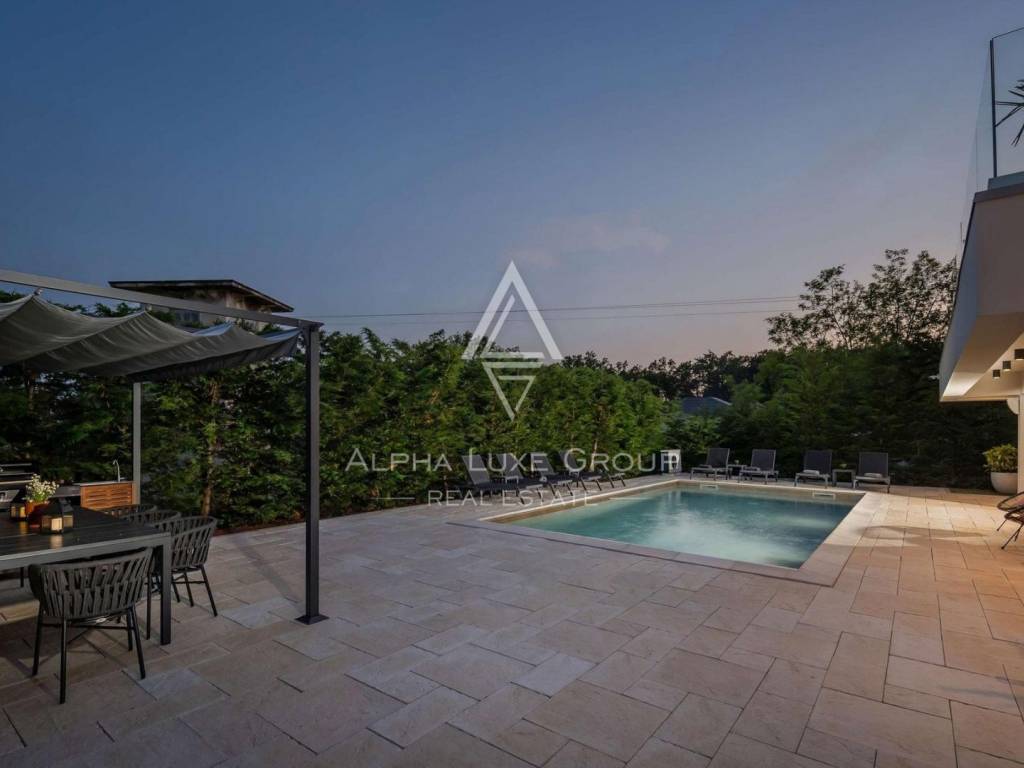 In the tranquil village of Lovrečica, Umag, a stunning modern villa is on offer. This exquisitely designed property, spanning 278 square meters, is nestled within a beautifully manicured 756-square-meter garden, promising an elite living experience.