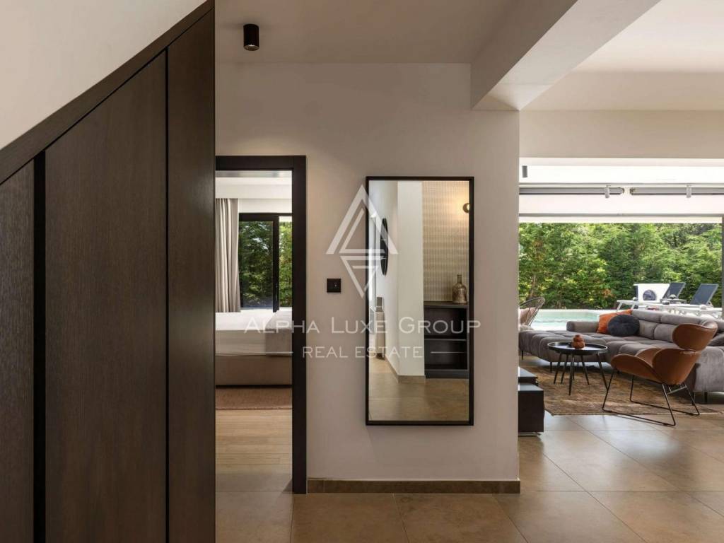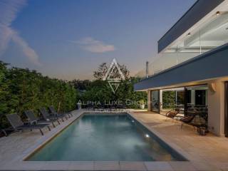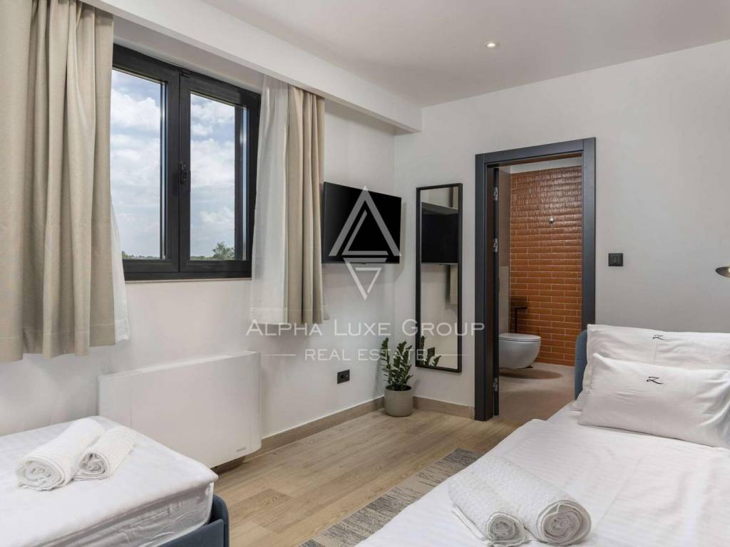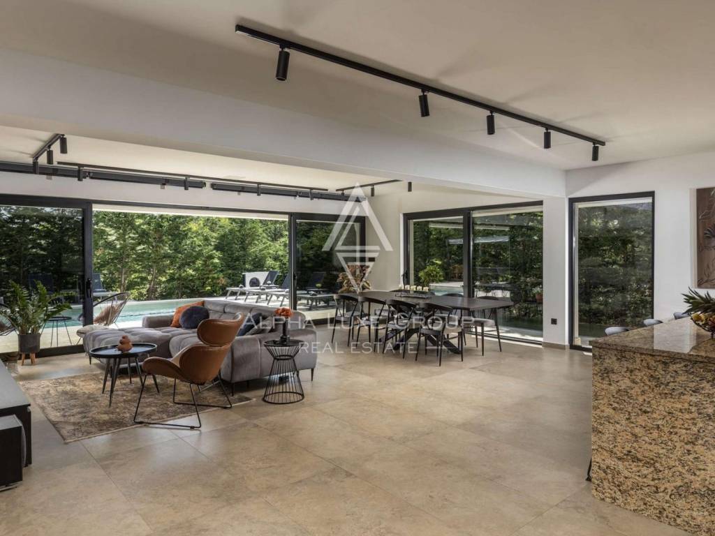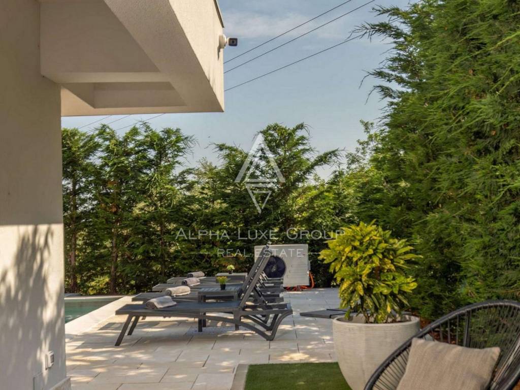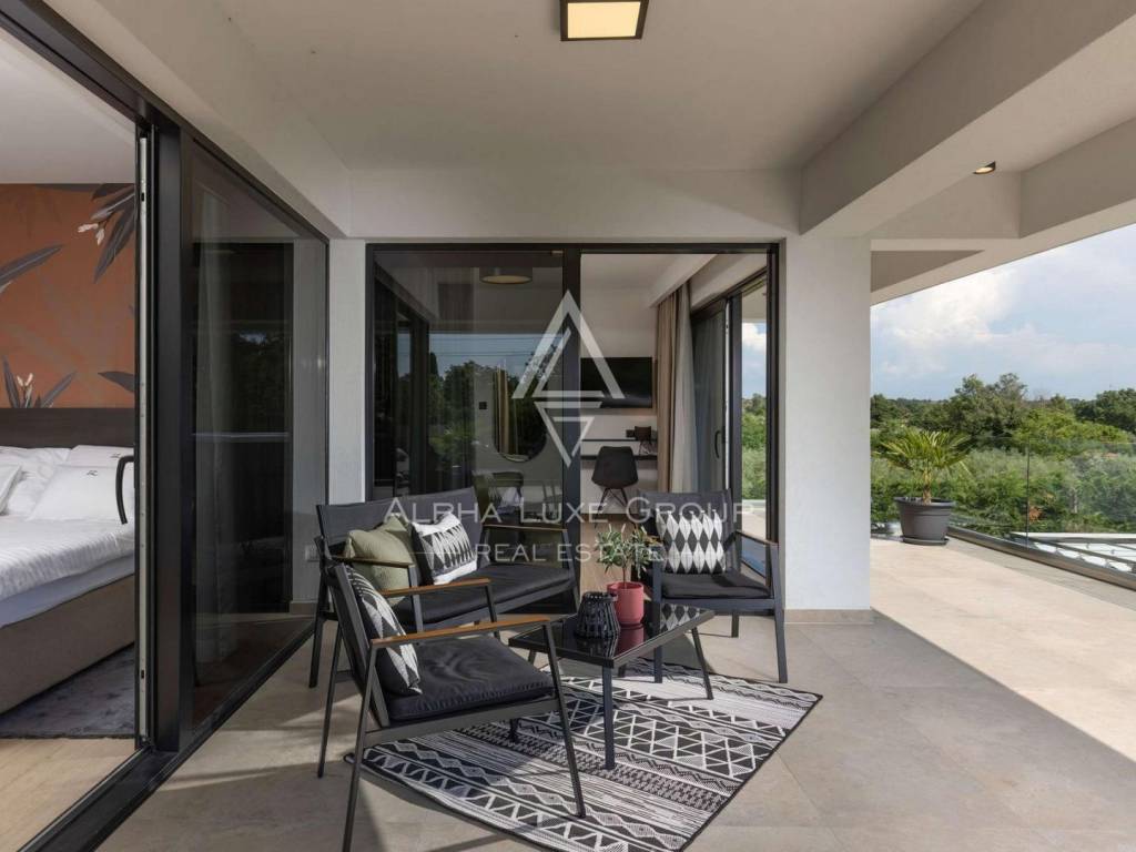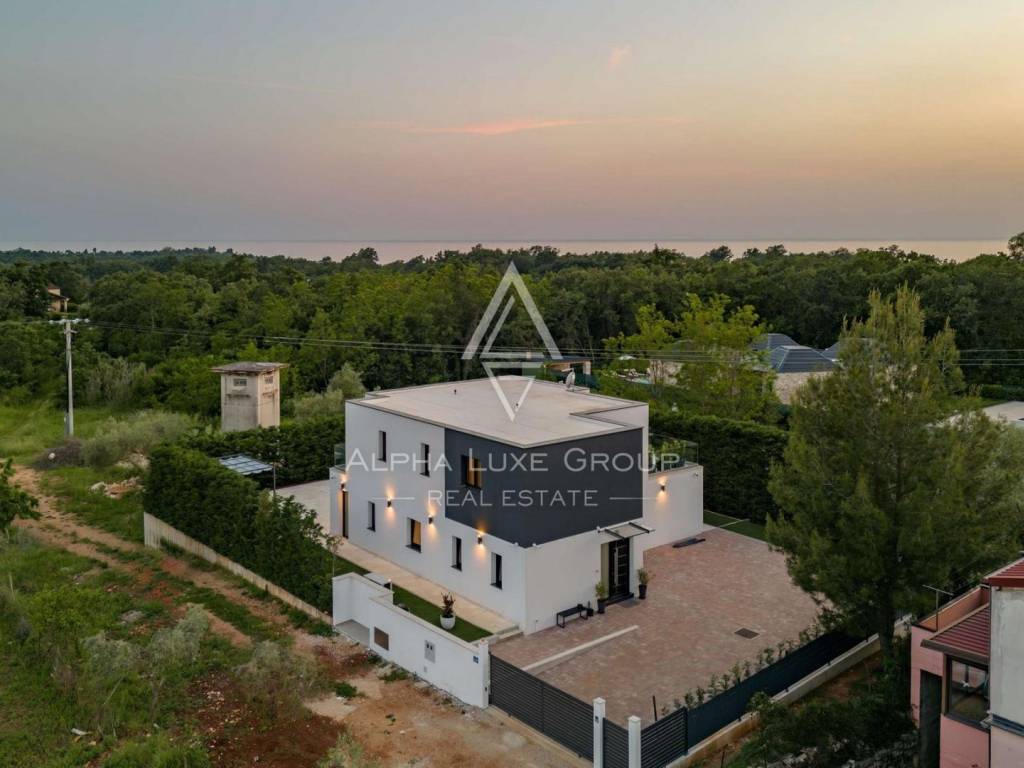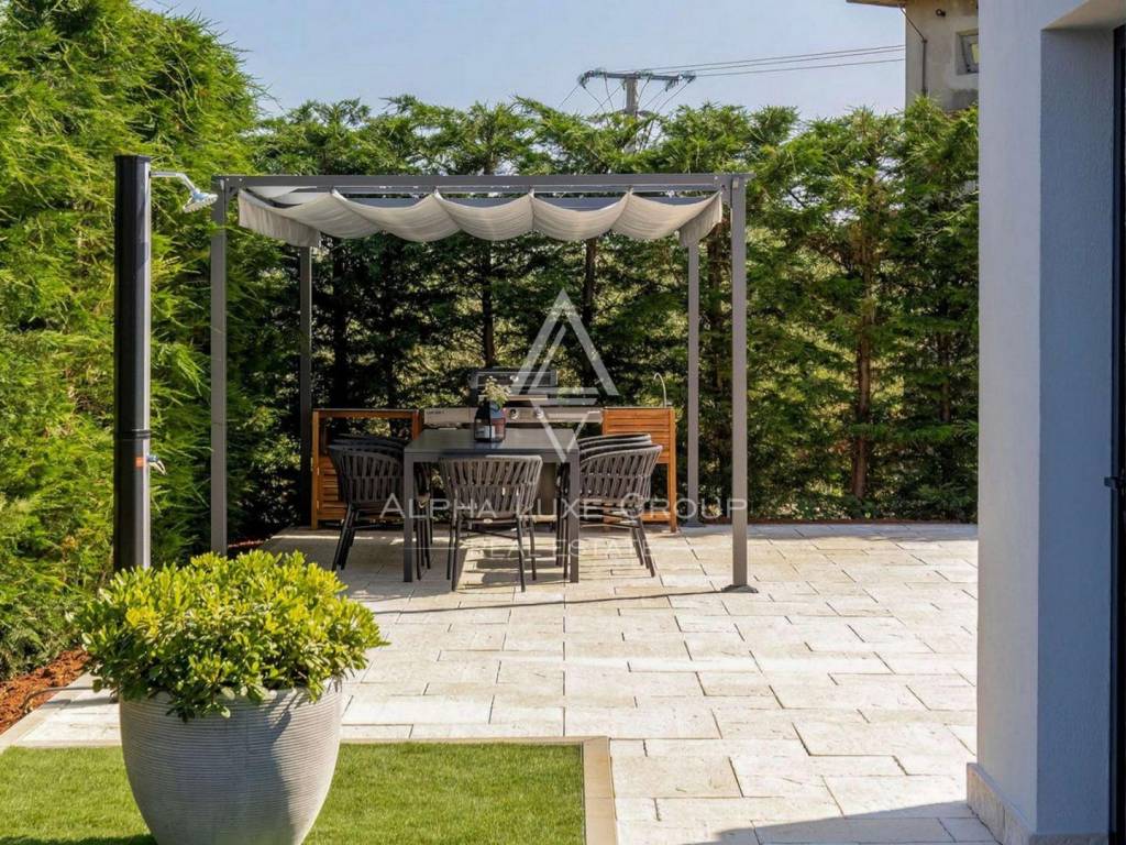 In the tranquil village of Lovrečica, Umag, a stunning modern villa is on offer. This exquisitely designed property, spanning 278 square meters, is nestled within a beautifully manicured 756-square-meter garden, promising an elite living experience.