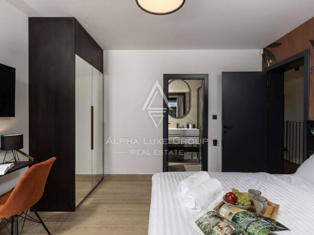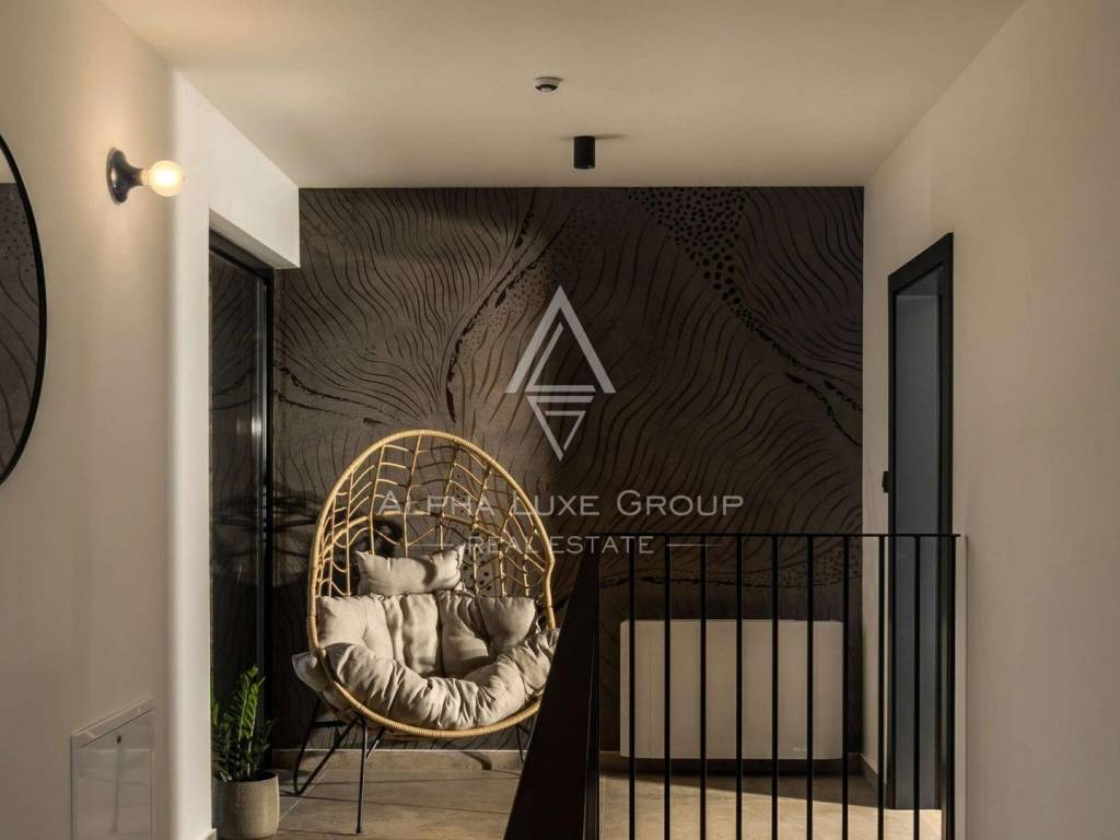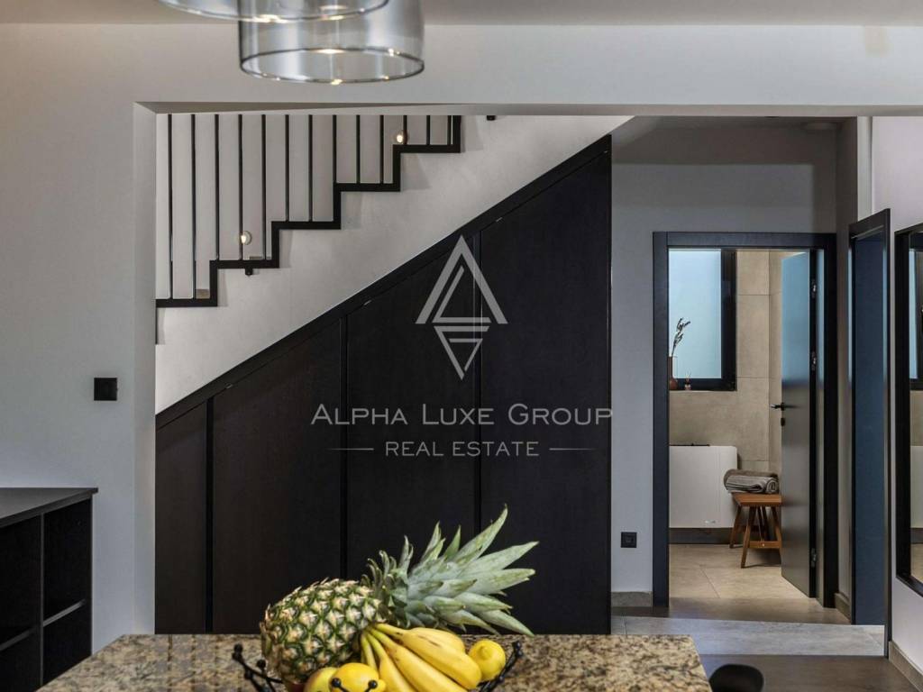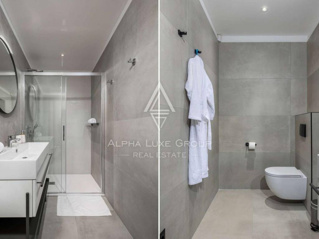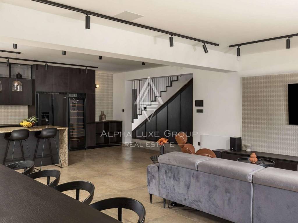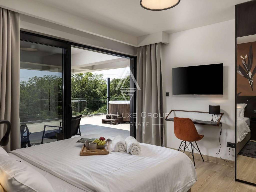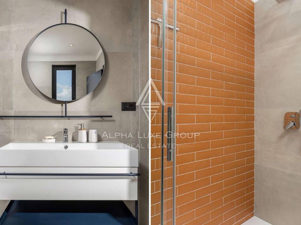 The upper level houses three chic bedrooms, each with private bathrooms. Two of these bedrooms open onto a vast covered terrace, complete with a jacuzzi, offering a scenic view of the locale.