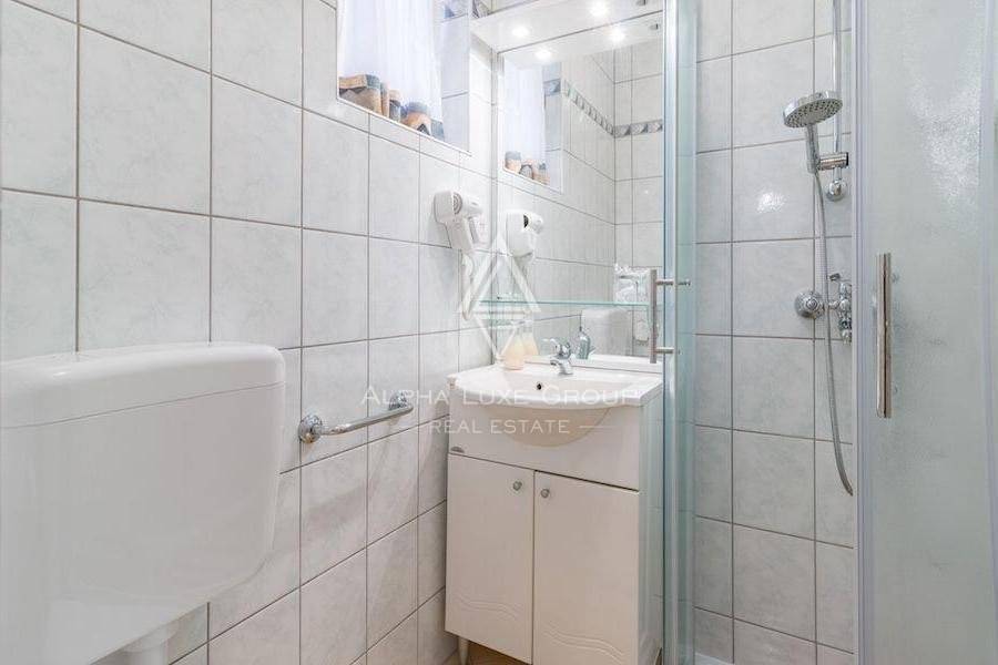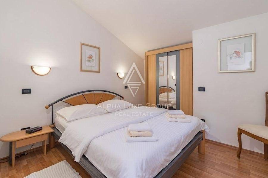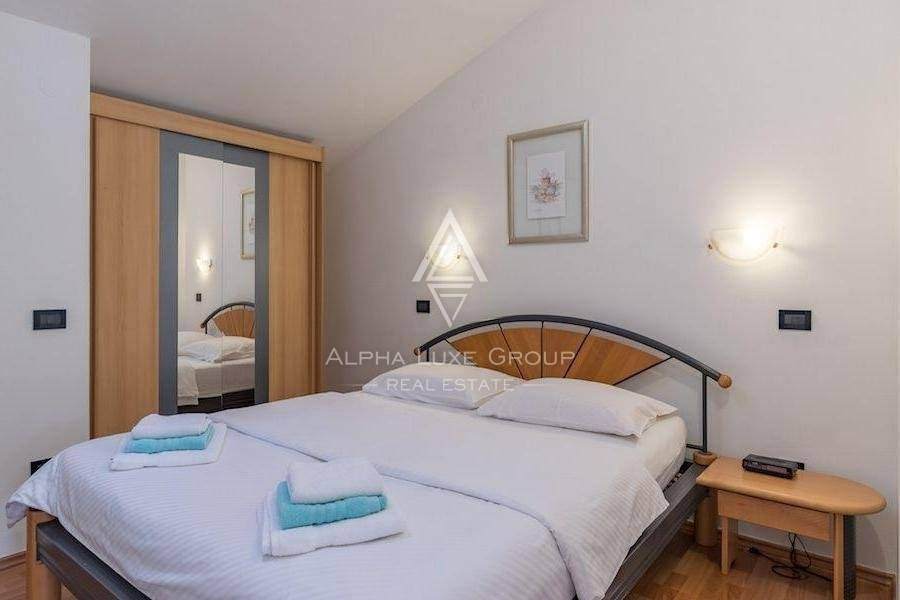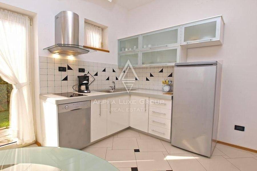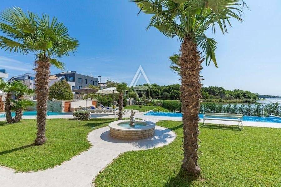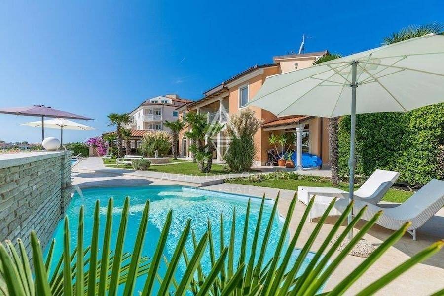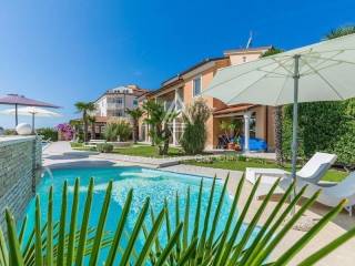 It consists of eight unique apartments with a living area of 550 m2 and a spacious garden of 1,050 m2 with two outdoor swimming pools, a sunbathing area for apartment guests, a covered area for sitting and socializing, beautiful palm trees, a fountain, and benches for enjoying a glass of Istrian wine on warm summer evenings. The villa also has private parking.
