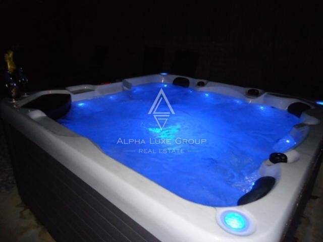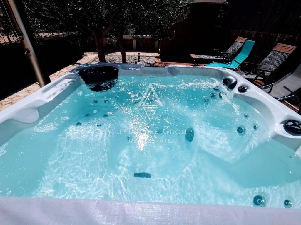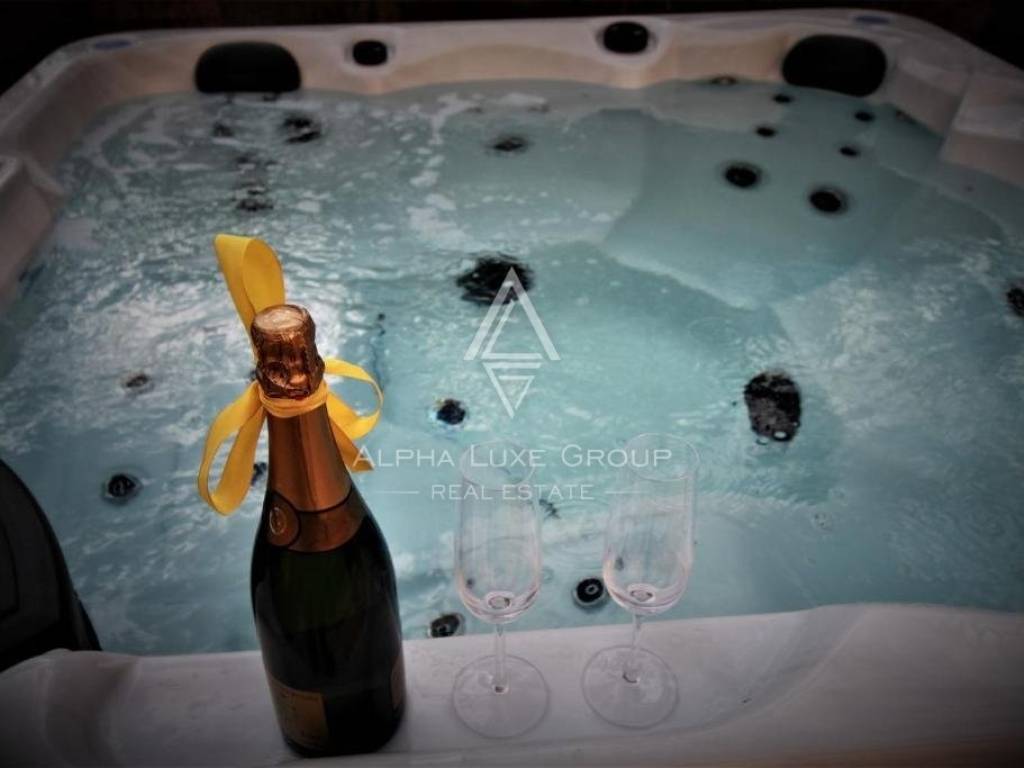 The highlight of this home is its wellness area, which includes a hot tub and an open-air bath, perfect for unwinding. The garden, adorned with barbecue facilities, offers an idyllic setting for relaxing and entertaining.