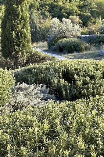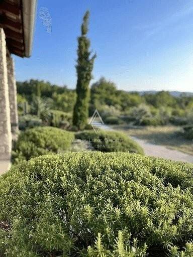 The outdoor area is a meticulously landscaped garden, adorned with cypress and olive trees, rosemary bushes, and various Mediterranean herbs. It's an oasis of tranquility, featuring a swimming pool with sun deck and a covered summer kitchen.