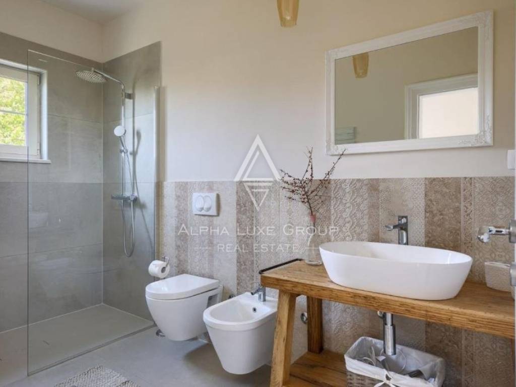 The ground floor is an invitation to comfort, with a living area seamlessly integrated with the dining room and kitchen. Rustic furnishings and tasteful décor create a homely yet sophisticated atmosphere, evident in every corner of the villa.